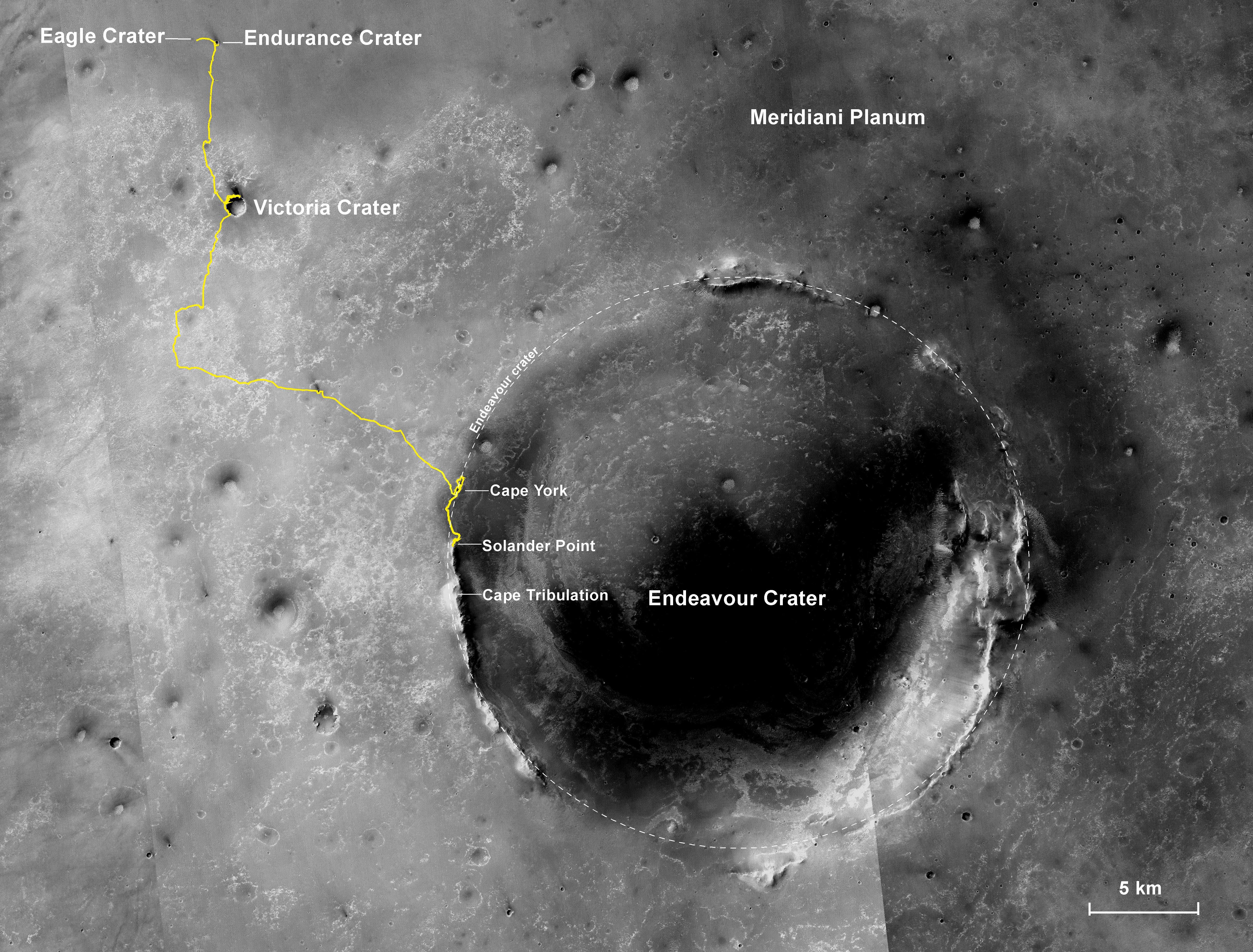 The gold line on this image shows NASA Opportunity route from the landing site, in upper left, to the area it is investigating on the western rim of Endeavour Crater as of the rover 10th anniversary on Mars, in Earth years.