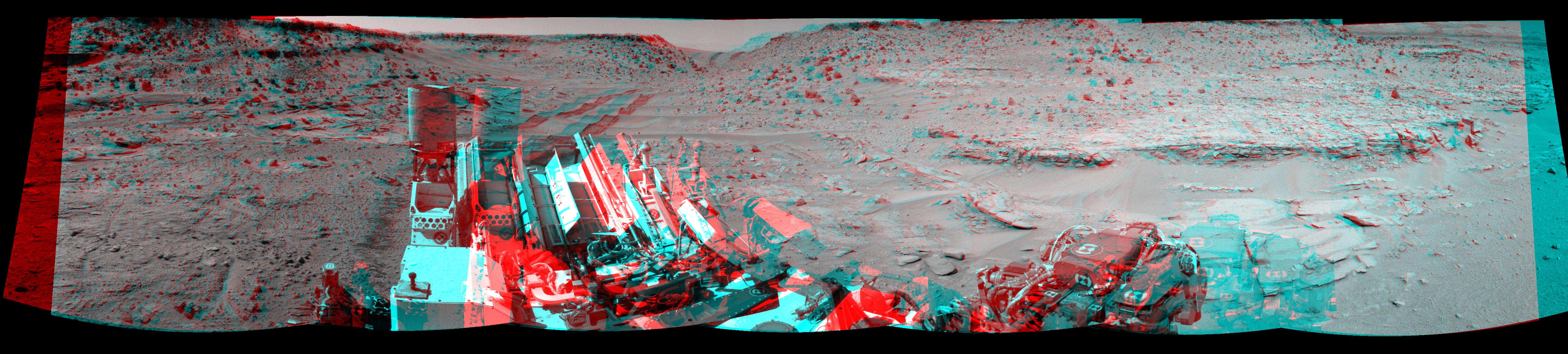 This stereo view combining images taken on Feb. 10, 2014, by the Navigation Camera Navcam on NASA Curiosity Mars rover looks back to where the rover crossed a dune at Dingo Gap four days earlier. You need 3D glasses to view this image.
