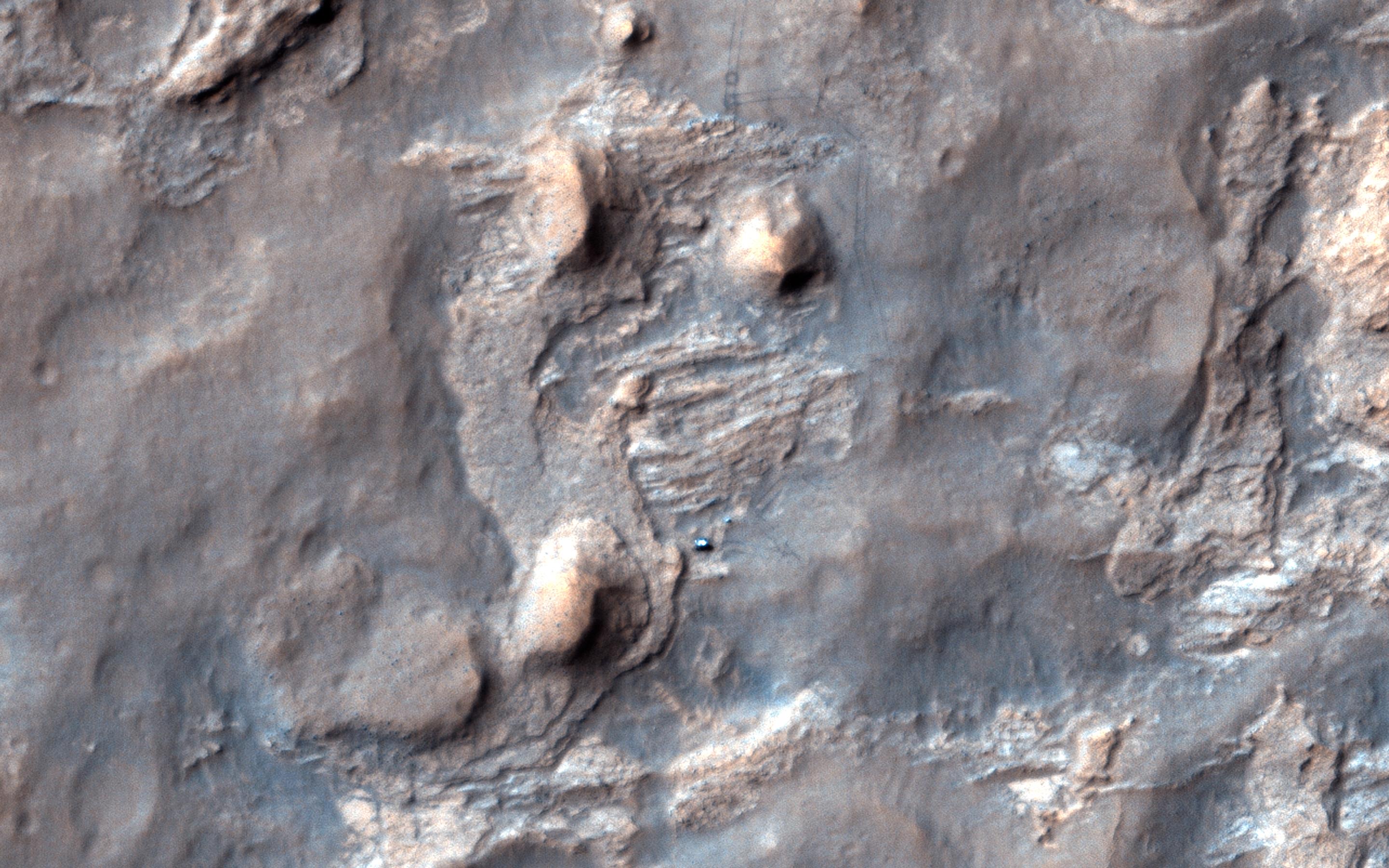 This image shows black gold, that is: organic material, which could be a biomarker sign of past life, the holy grail of Mars exploration. This image is from NASA Mars Reconnaissance Orbiter.