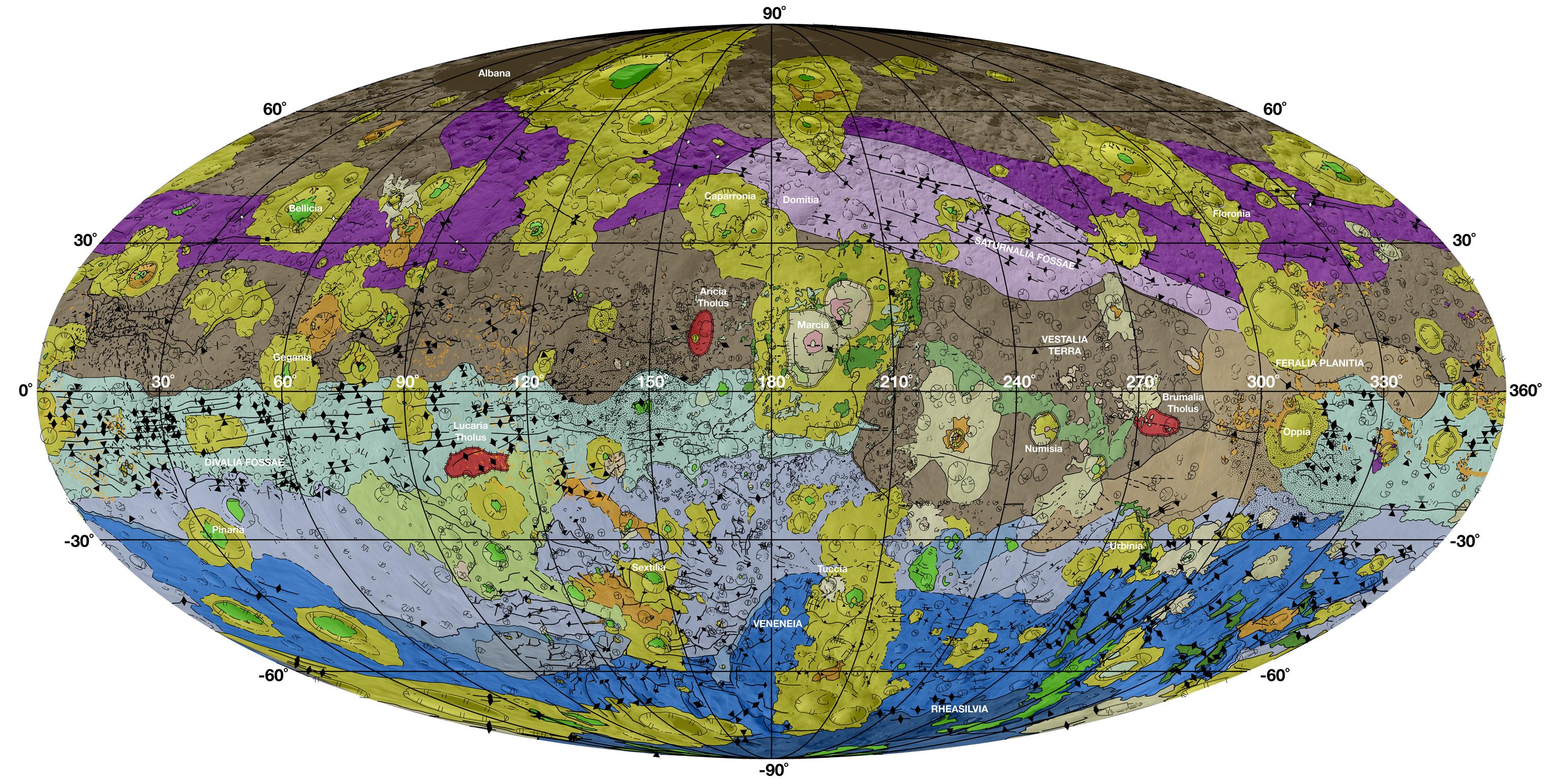 This high-resolution geological map of Vesta is derived from NASA Dawn spacecraft data.