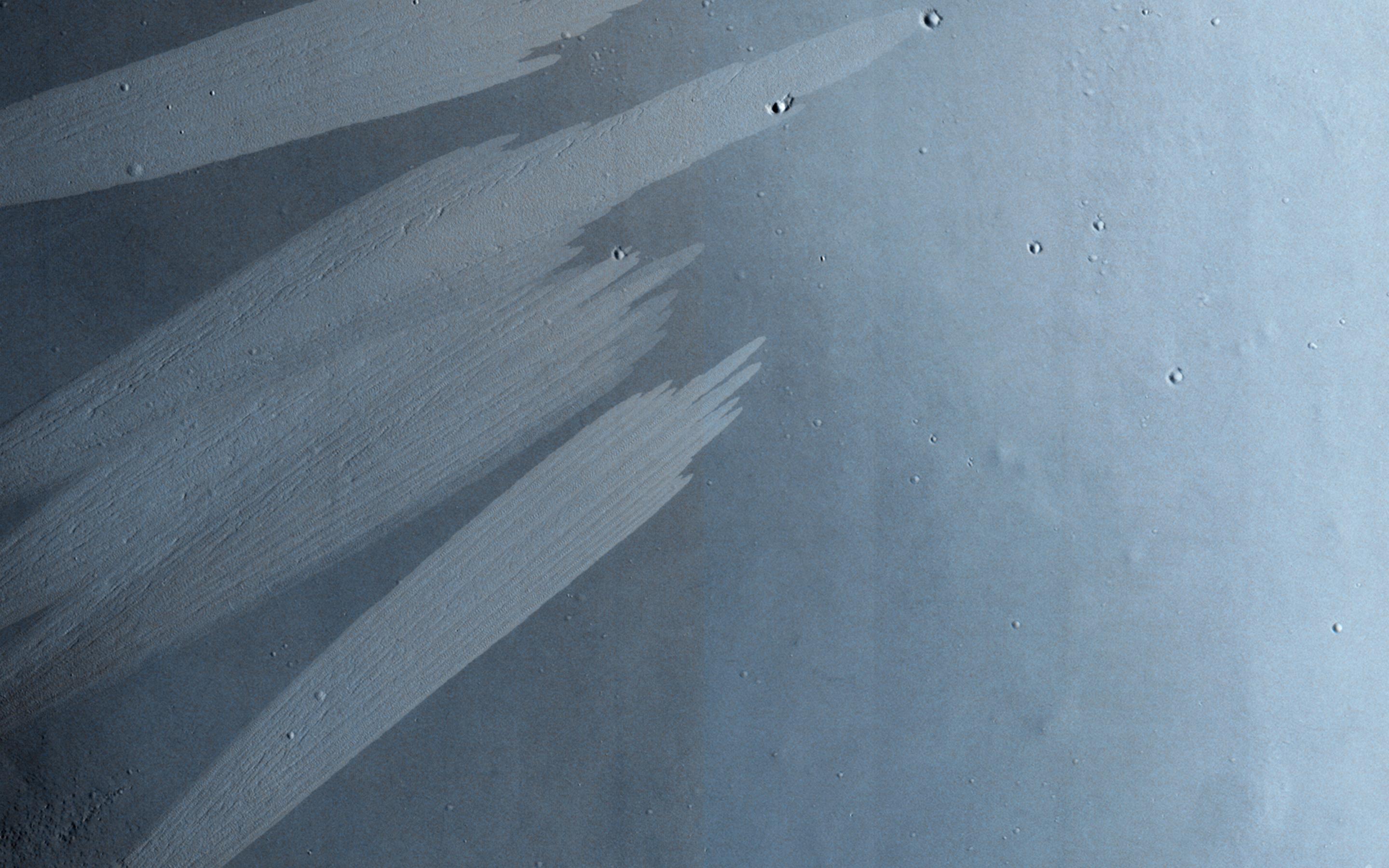 This observation from NASA Mars Reconnaissance Orbiter shows bright and dark slope streaks in craters in the Arabia Terra region.
