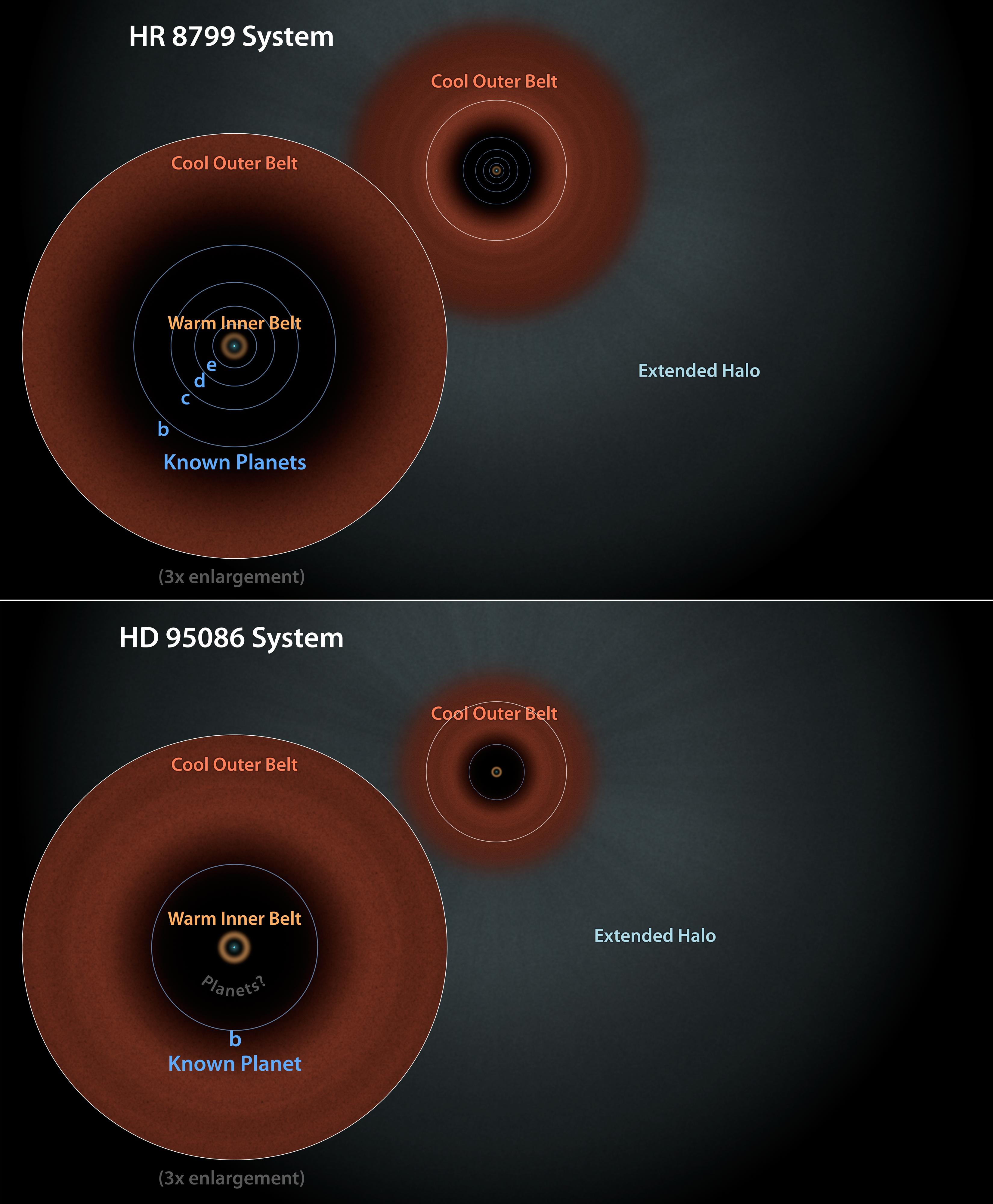 This diagram illustrates two similar star systems, HD 95086 and HR 8799. Evidence from NASA Spitzer Space Telescope has pointed to the presence of two dust belts in each system.