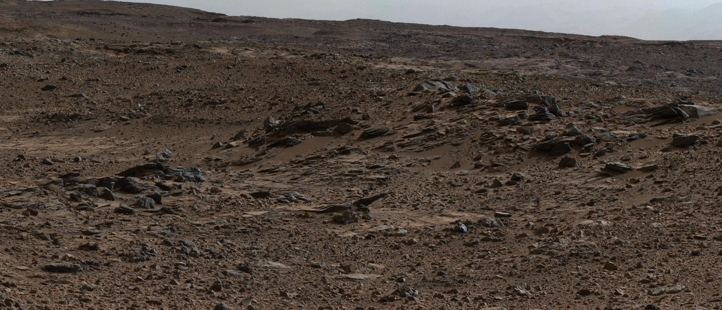 This image shows inclined beds characteristic of delta deposits where a stream entered a lake, but at a higher elevation and farther south than other delta deposits north of Mount Sharp.