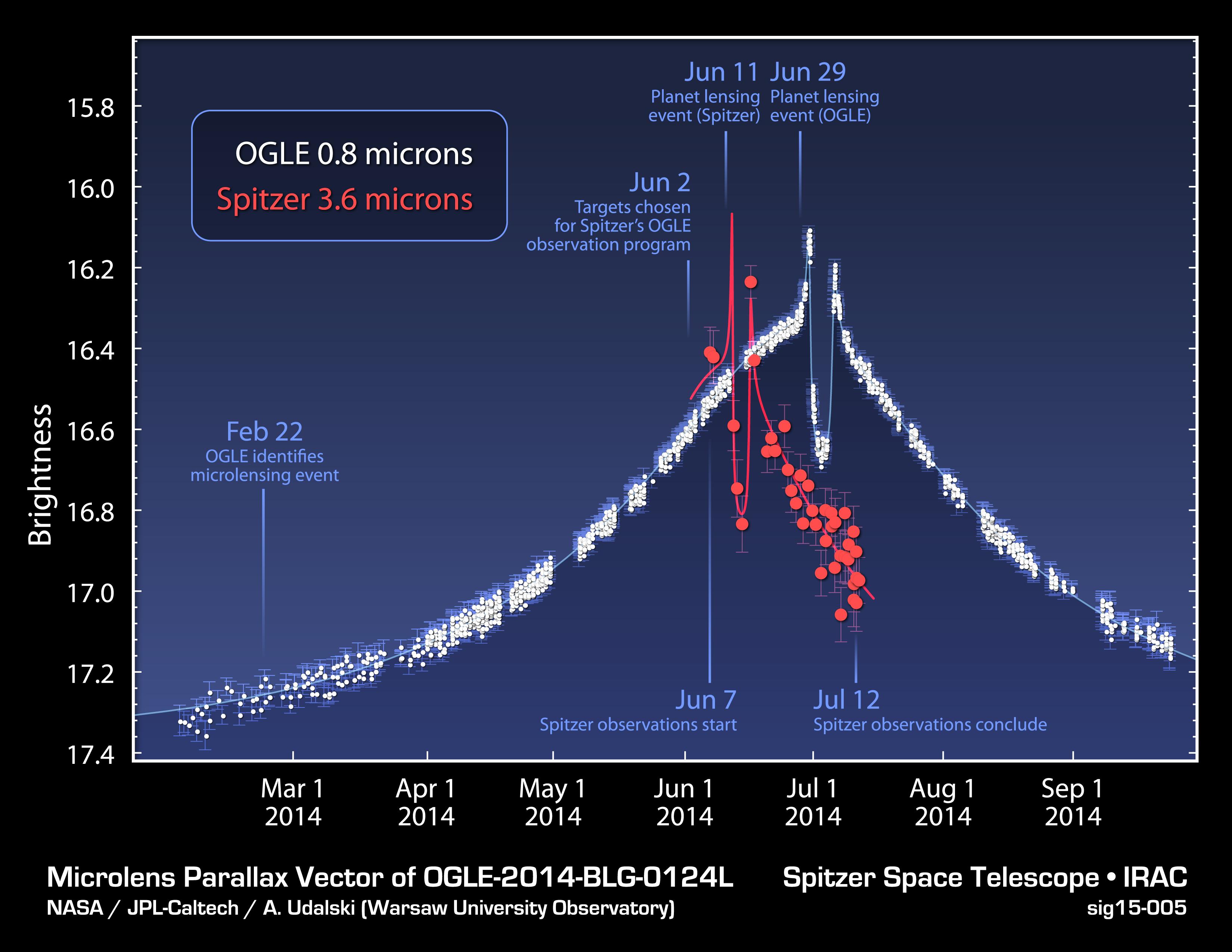 This plot shows data obtained from NASA's Spitzer Space Telescope and the Optical Gravitational Lensing Experiment, or OGLE, telescope located in Chile, during a "microlensing" event. Microlensing events occur when one star passes another, and the gravity of the foreground star causes the distant star's light to magnify and brighten. This magnification is evident in the plot, as both Spitzer and OGLE register an increase in the star's brightness. If the foreground star is circled by a planet, the planet's gravity can alter the magnification over a shorter period, seen in the plot in the form of spikes and a dip. The great distance between Spitzer, in space, and OGLE, on the ground, meant that Spitzer saw this particular microlensing event before OGLE. The offset in the timing can be used to measure the distance to the planet. In this case, the planet, called OGLE-2014-BLG-0124L, was found to be 13,000 light-years away, near the center of our Milky Way galaxy. The finding was the result of fortuitous timing because Spitzer's overall program to observe microlensing events was only just starting up in the week before the planet's effects were visible from Spitzer's vantage point. While Spitzer sees infrared light of 3.6 microns in wavelength, OGLE sees visible light of 0.8 microns. http://photojournal.jpl.nasa.gov/catalog/PIA19331