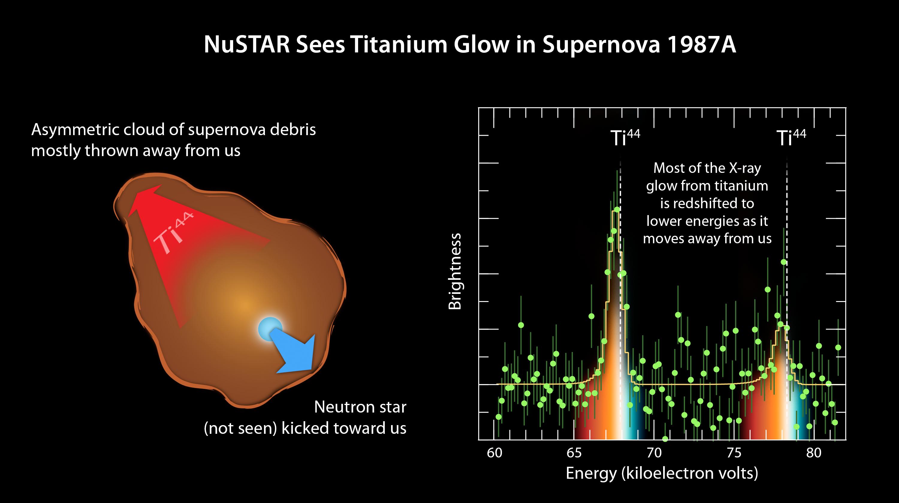 The plot of data from NASA's Nuclear Spectroscopic Telescope Array, or NuSTAR (right), amounts to a "smoking gun" of evidence in the mystery of how massive stars explode. The observations indicate that supernovae belonging to a class called Type II or core-collapse blast apart in a lopsided fashion, with the core of the star hurtling in one direction, and the ejected material mostly expanding the other way (see diagram in Figure 1). NuSTAR made the most precise measurements yet of a radioactive element, called titanium-44, in the supernova remnant called 1987A. NuSTAR sees high-energy X-rays, as shown here in the plot ranging from 60 to more than 80 kiloelectron volts. The spectral signature of titanium-44 is apparent as the two tall peaks. The white line shows where one would expect to see these spectral signatures if the titanium were not moving. The fact that the spectral peaks have shifted to lower energies indicates that the titanium has "redshifted," and is moving way from us. This is similar to what happens to a train's whistle as the train leaves the station. The whistle's sound shifts to lower frequencies. NuSTAR's detection of redshifted titanium reveals that the bulk of material ejected in the 1987A supernova is flying way from us at a velocity of 1.6 million miles per hour (2.6 million kilometers per hour). Had the explosion been spherical in nature, the titanium would have been seen flying uniformly in all directions. This is proof that this explosion occurred in an asymmetrical fashion. http://photojournal.jpl.nasa.gov/catalog/PIA19335