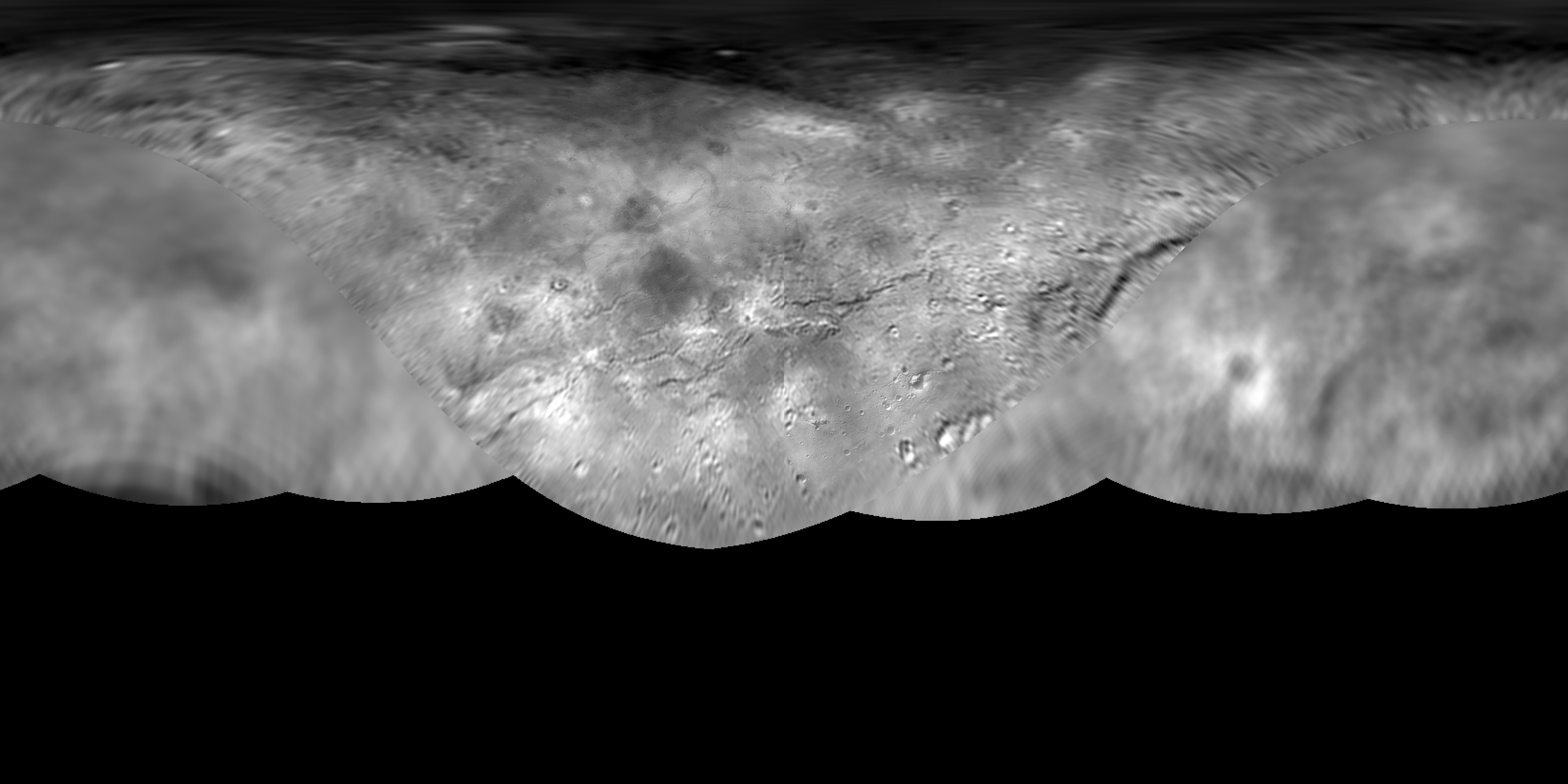 The science team of NASA's New Horizons mission has produced this global map of Pluto's largest moon, Charon. The map includes all available resolved images of the surface acquired between July 7-14, 2015, at pixel resolutions ranging from 40 kilometers (24 miles) on the anti-Pluto facing hemisphere (left and right sides of the map), to 400 meters (1,250 feet) per pixel on portions of the Pluto-facing hemisphere -- the side facing the New Horizons spacecraft when it flew past the dwarf planet -- at map center. Many additional images now stored on the spacecraft's digital data recorders are expected to be transmitted "home" in fall 2015 and these will be used to complete the global map. The map is in simple cylindrical projection, with zero longitude (the Pluto-facing direction) in the center. http://photojournal.jpl.nasa.gov/catalog/PIA19866