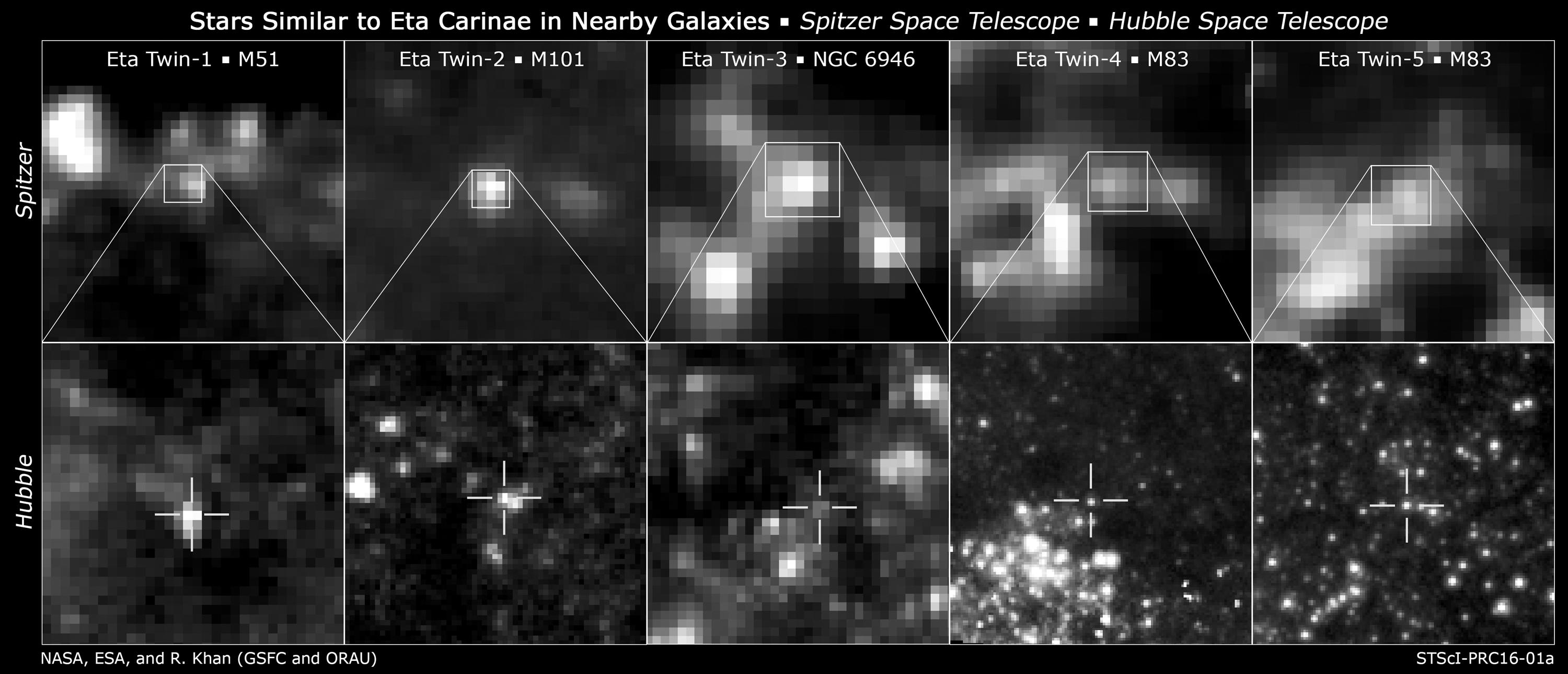 Researchers found likely twins of the giant, erupting star Eta Carinae by comparing infrared images from NASA Spitzer Space Telescope (top) and NASA Hubble Space Telescope (bottom). Astronomers cannot yet explain what caused the titanic eruption of star Eta Carinae in the 1840s. The discovery of likely Eta Carinae "twins" in other galaxies will help scientists better understand this brief phase in the life of a massive star. http://photojournal.jpl.nasa.gov/catalog/PIA20018