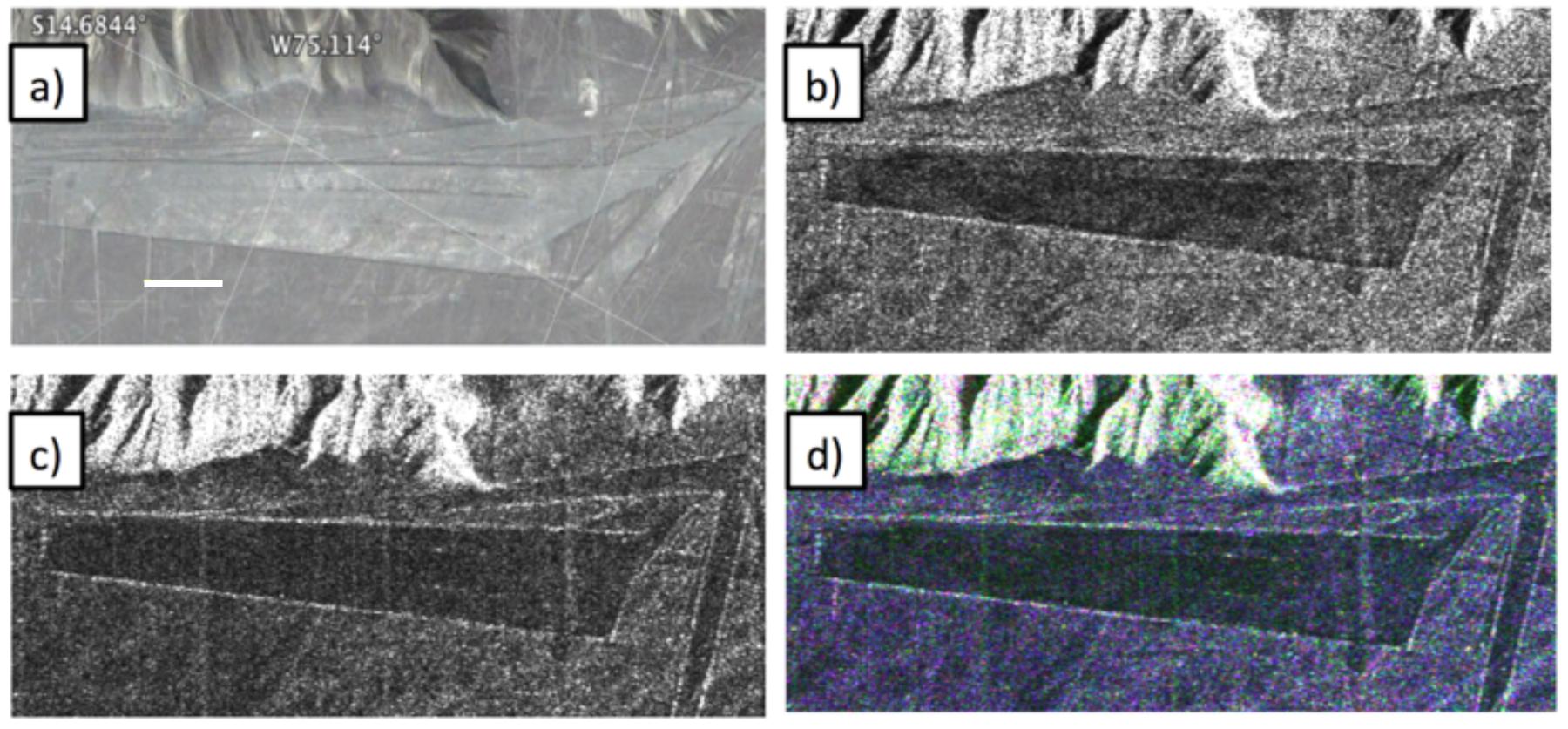 Different visualizations of an area with geometric geoglyphs at the Nasca World Heritage Site in Peru as seen by NASA Uninhabited Aerial Vehicle Synthetic Aperture Radar UAVSAR.