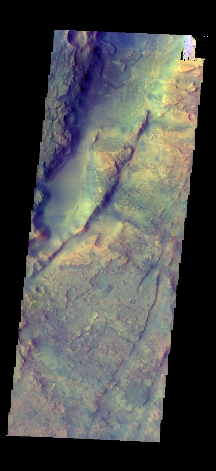The THEMIS camera contains 5 filters. The data from different filters can be combined in multiple ways to create a false color image. This image from NASA 2001 Mars Odyssey spacecraft shows part of Nili Fossae.