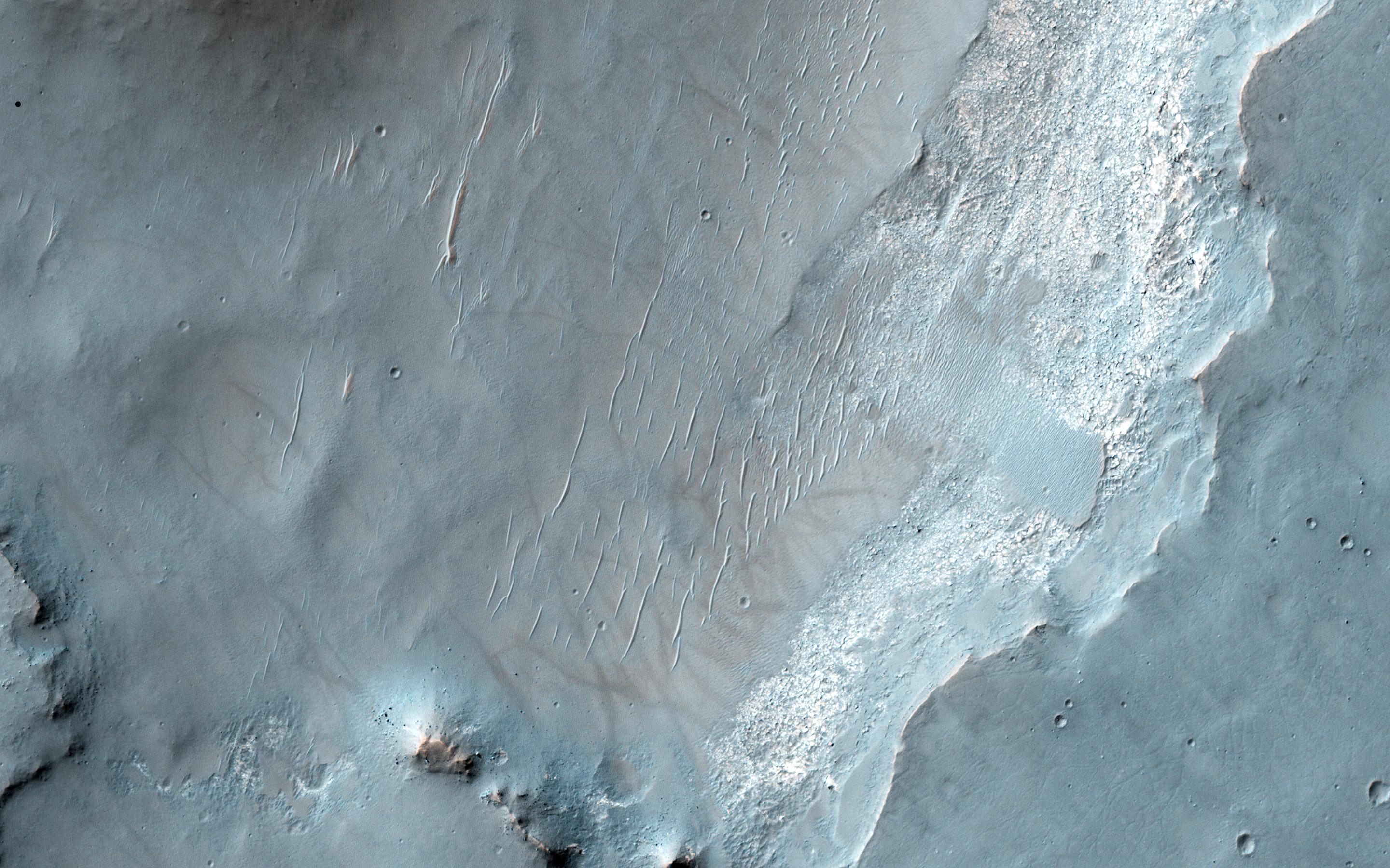 This image from NASA Mars Reconnaissance Orbiter spacecraft shows an exposure of bedrock on the floor of Bakhuysen Crater, an impact crater in Noachis Terra. The bedrock is highly fragmented and fractured.