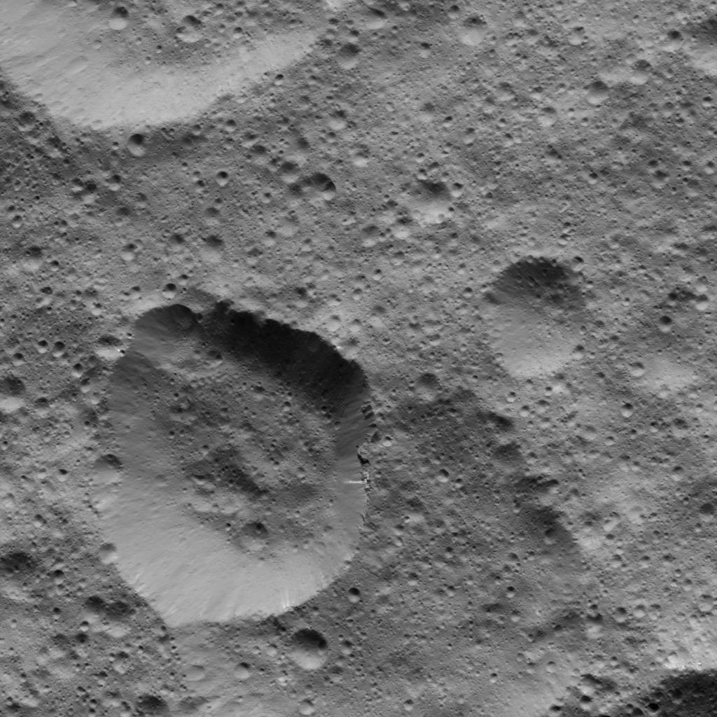 This picture from NASA Dawn spacecraft shows craters in the northern hemisphere of Ceres. The large crater at lower left displays several bright streaks on its walls.