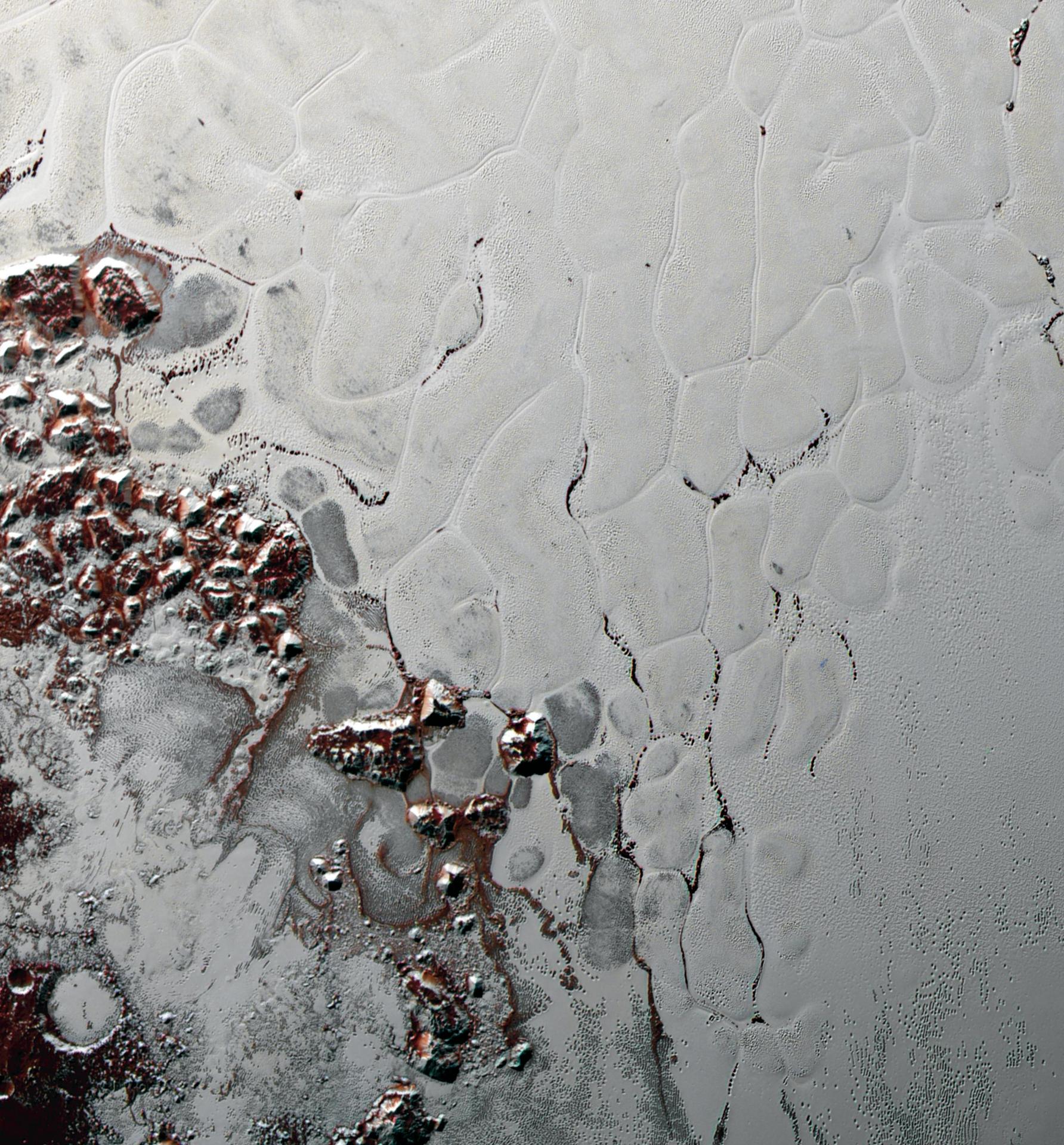 Like a cosmic lava lamp, a large section of Pluto's icy surface is being constantly renewed by a process called convection that replaces older surface ices with fresher material. Scientists from NASA's New Horizons mission used state-of-the-art computer simulations to show that the surface of Pluto's informally named Sputnik Planum is covered with churning ice "cells" that are geologically young and turning over due to a process called convection. The scene above, which is about 250 miles (400 kilometers) across, uses data from the New Horizons Ralph/Multispectral Visible Imaging Camera (MVIC), gathered July 14, 2015. Their findings are published in the June 2, 2016, issue of the journal Nature. http://photojournal.jpl.nasa.gov/catalog/PIA20726