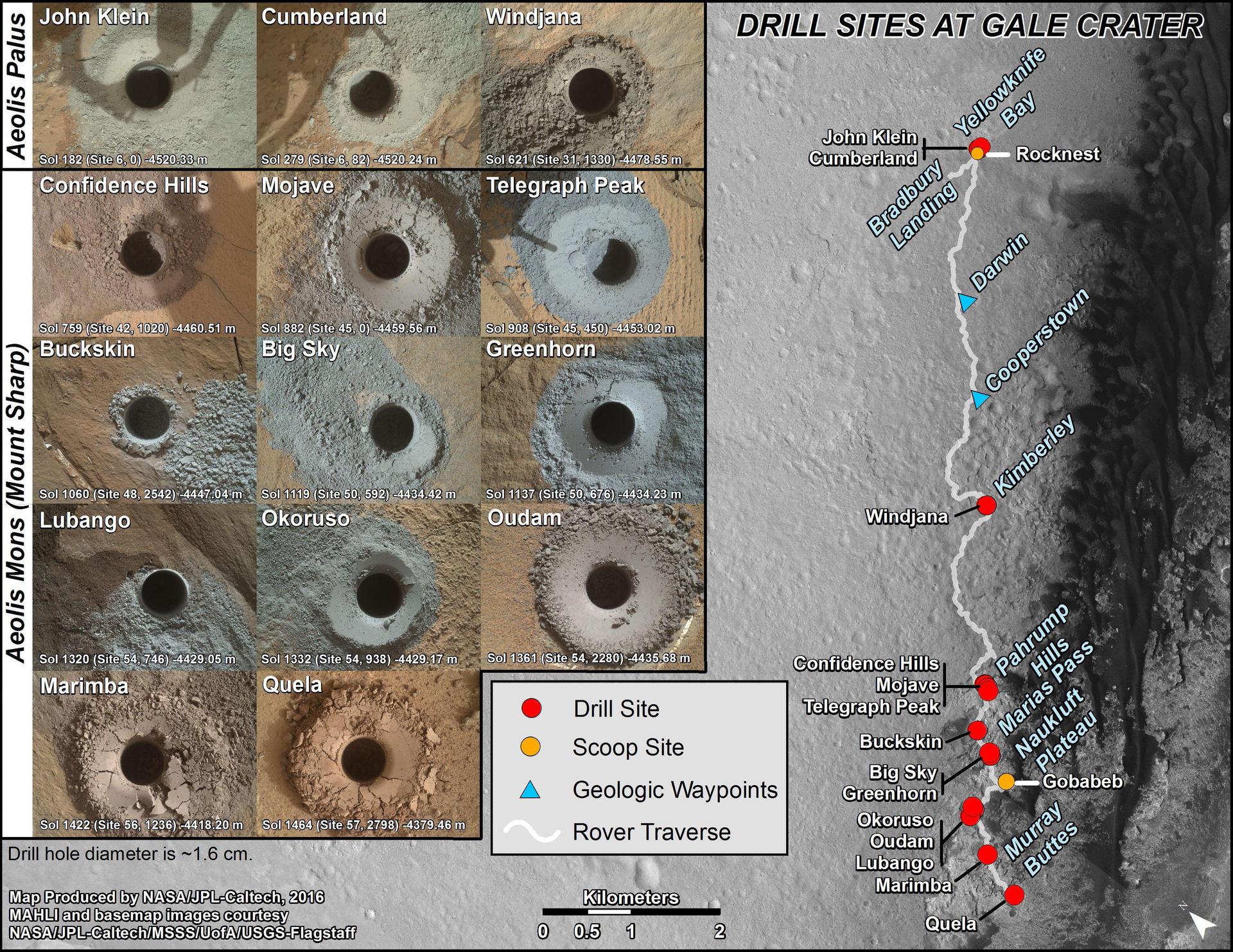 This graphic maps locations of the sites where NASA's Curiosity Mars rover collected its first 18 rock or soil samples for analysis by laboratory instruments inside the vehicle. It also presents images of the drilled holes where 14 rock-powder samples were acquired. Curiosity scooped two soil samples at each of the other two sites: Rocknest and Gobabeb. The diameter of each drill hole is about 0.6 inch (1.6 centimeters), slightly smaller than a U.S. dime. The images used here are raw color, as recorded by the rover's Mars Hand Lens Imager (MAHLI) camera. Notice the differences in color of the material at different drilling sites. For the map, north is toward upper left corner. The scale bar represents 2 kilometers (1.2 miles). The base map is from the High Resolution Imaging Science Experiment (HiRISE) camera on NASA's Mars Reconnaissance Orbiter. The latest sample site included is "Quela,"where Curiosity drilled into bedrock of the Murray formation on Sept. 18, 2016, during the 1,464th Martian day, or sol, of the mission. Curiosity landed in August 2012 on the plain (named Aeolis Palus) near Mount Sharp (or Aeolis Mons). More drilling samples collected by MSL are available at http://photojournal.jpl.nasa.gov/catalog/PIA20845
