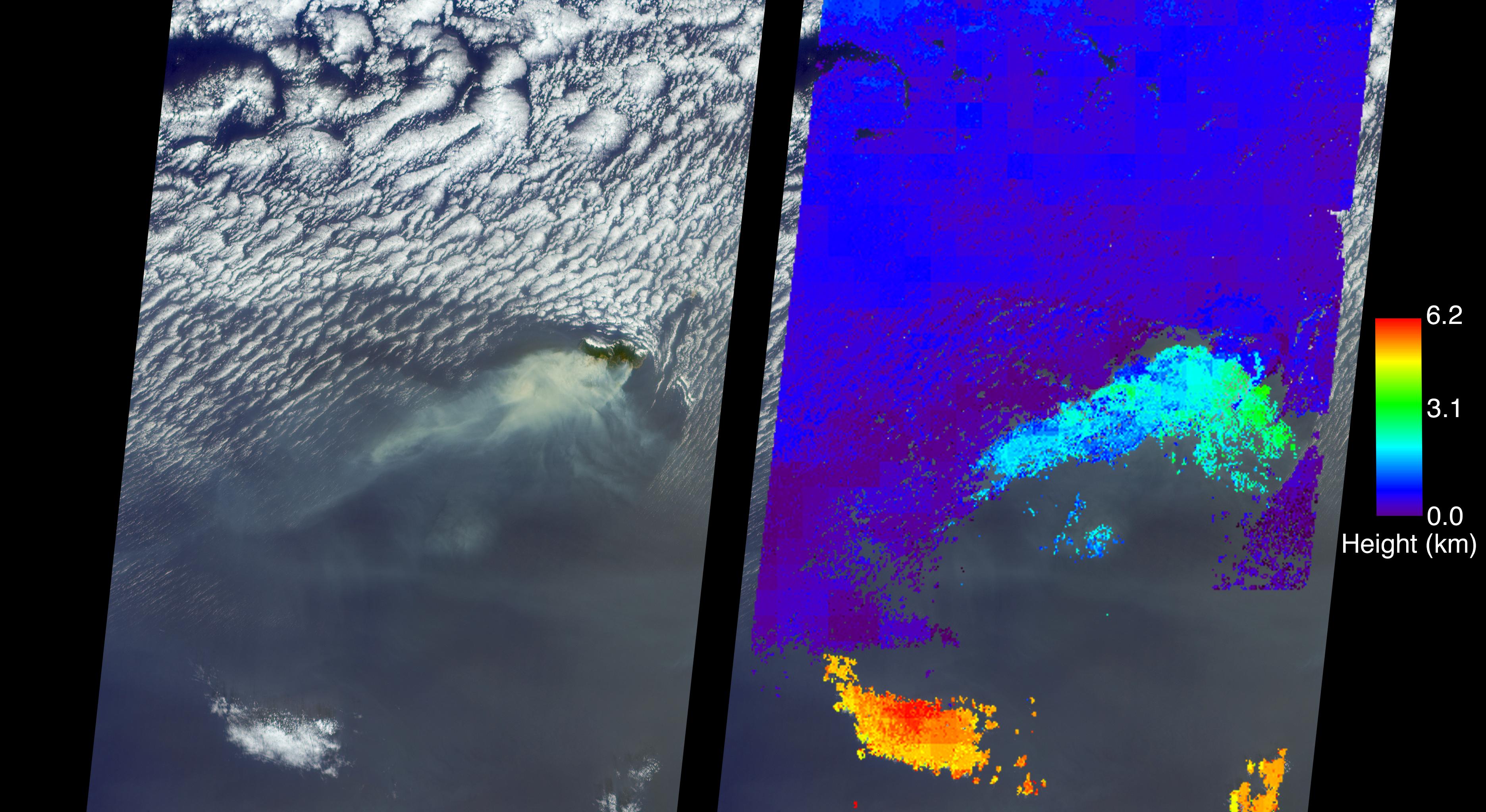 A wildfire spread to the capital city of Funchal on the island of Madeira, an autonomous region of Portugal, over the nighttime hours of Tuesday, Aug. 9, 2016, with three deaths reported and hundreds of others hospitalized. Several homes and a luxury hotel have burned, and a thousand people have been evacuated. The three fatalities are reported to be elderly people who were unable to escape when their homes caught fire. The fire ignited Monday, Aug. 8, after several weeks of scorching temperatures topping 95 degrees Fahrenheit and very dry weather. The entire island is only 30 miles (48 kilometers) from end to end, which naturally makes protecting the island's 270,000 residents and many tourists more difficult. The MISR (Multi-angle Imaging SpectroRadiometer) instrument aboard NASA's Terra satellite passed directly over the island of Madeira on Wednesday, Aug. 10, 2016. The left image is a true-color image taken by MISR's 60-degree forward-pointing camera. This oblique view gives a better view of the smoke than a downward-pointing view. The island of Madeira is the only land within the field of view, and the smoke from the wildfire is being blown to the southwest. The city of Funchal is located on the southeastern coast of the island. MISR's nine cameras, each viewing Earth at a different angle, can be used to determine the height of clouds and smoke above the surface in much the same way that our two eyes, pointing in slightly different directions, give us depth perception. The right-hand image shows MISR's publically available standard cloud top height product. These data show that the main body of clouds is indeed very low, less than 0.6 miles (1 kilometer) above sea level, while the smoke plume is about 1.9 miles (3 kilometers) high at the source, dropping lower as it is blown to the southwest. A stereo "anaglyph" of this scene is also available at PIA20886. As can be seen from both the MISR height product and the 3D anaglyph, the isolated clouds to the south are much higher than either the low clouds or the plume. Interestingly, the low clouds drop to almost sea level and then die out near where the smoke is present. These data were acquired during Terra orbit 88524. http://photojournal.jpl.nasa.gov/catalog/PIA20887