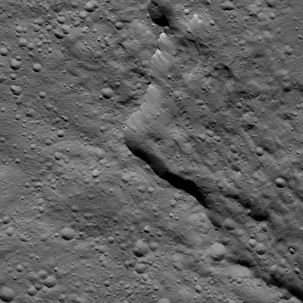 This view from NASA's Dawn spacecraft taken on May 29, 2016, shows the southern rim of Gaue Crater on Ceres. Dawn took this image on May 29, 2016, from its low-altitude mapping orbit, at a distance of about 240 miles (385 kilometers) above the surface. The image resolution is 120 feet (35 meters) per pixel. http://photojournal.jpl.nasa.gov/catalog/PIA20923
