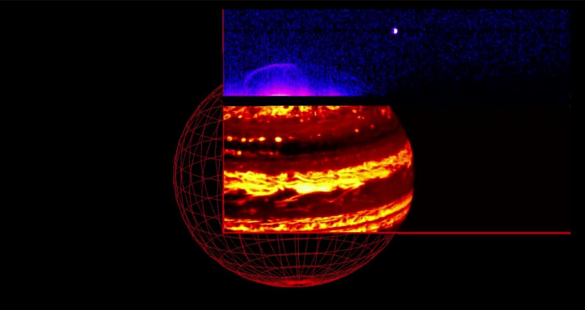 As NASA's Juno spacecraft approached Jupiter on Aug. 27, 2016, the Jovian Infrared Auroral Mapper (JIRAM) instrument captured the planet's glow in infrared light. The video is composed of 580 images collected over a period of about nine hours while Jupiter completed nearly a full rotation on its axis. The video shows the two parts composing the JIRAM imager: the lower one, in a red color scale, is used for mapping the planet's thermal emission at wavelengths around 4.8 microns; the upper one, in a blue color scale, is used to map the auroras at wavelengths around 3.45 microns. In this case the exposure time of the imager was optimized to observe the planet's thermal emission. However, it is possible to see a faint aurora and Jupiter's moon Io approaching the planet. The Great Red Spot is also visible just south of the planet's equator. A movie is available at http://photojournal.jpl.nasa.gov/catalog/PIA21036
