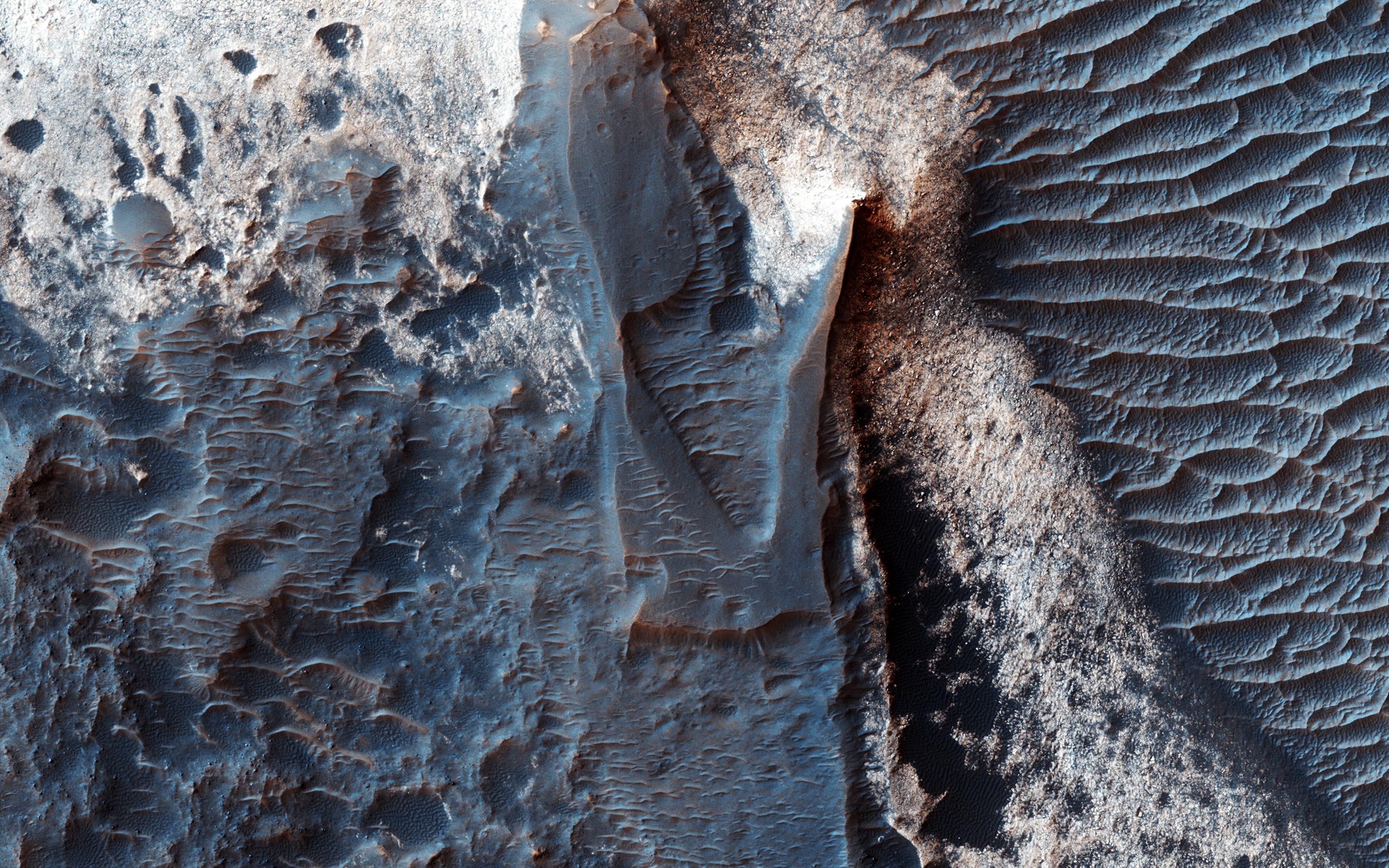 It has been known since the 1970s when the Viking orbiters took pictures of Mars that there are large (i.e., several kilometers-thick) mounds of light-toned deposits within the central portion of Valles Marineris. More recent higher resolution images of Mars, including this image of Melas Chasma, show that the wall rocks of Valles Mariners also contain similar, albeit thinner, light-toned deposits. Spectral data from the CRISM instrument indicate that the larger mounds are composed of sulfates. Some of the wall rock deposits are also made up of sulfates, but others contain clays or mixtures of several kinds of hydrated materials, suggesting that multiple aqueous processes, perhaps at different times within Valles Marineris, formed the variety of deposits we now observe. http://photojournal.jpl.nasa.gov/catalog/PIA21102