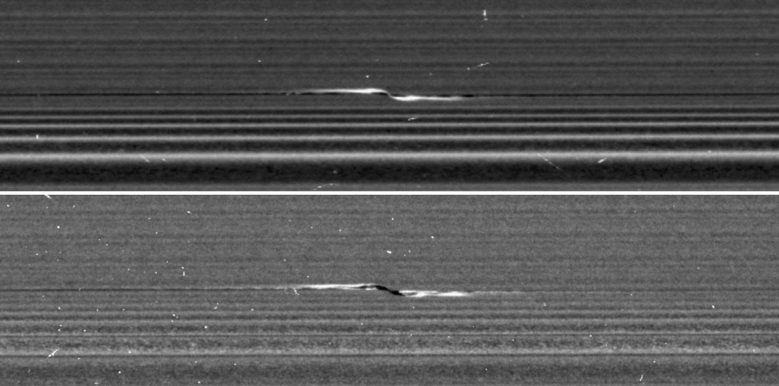 NASA's Cassini spacecraft captured these remarkable views of a propeller feature in Saturn's A ring on Feb. 21, 2017. These are the sharpest images taken of a propeller so far, and show an unprecedented level of detail. The propeller is nicknamed "Santos-Dumont," after the pioneering Brazilian-French aviator. This observation was Cassini's first targeted flyby of a propeller. The views show the object from vantage points on opposite sides of the rings. The top image looks toward the rings' sunlit side, while the bottom image shows the unilluminated side, where sunlight filters through the backlit ring. The two images presented as figure 1 are reprojected at the same scale (0.13 mile or 207 meters per pixel) in order to facilitate comparison. The original images, which have slightly different scales, are also provided here, without reprojection, as figure 2; the sunlit-side image is at left, while the unlit-side image is at right. Cassini scientists have been tracking the orbit of this object for the past decade, tracing the effect that the ring has upon it. Now, as Cassini has moved in close to the ring as part of its ring-grazing orbits, it was able to obtain this extreme close-up view of the propeller, enabling researchers to examine its effects on the ring. These views, and others like them, will inform models and studies in new ways going forward. Like a frosted window, Saturn's rings look different depending on whether they are seen fully sunlit or backlit. On the lit side, the rings look darker where there is less material to reflect sunlight. On the unlit side, some regions look darker because there is less material, but other regions look dark because there is so much material that the ring becomes opaque. Observing the same propeller on both the lit and unlit sides allows scientists to gather richer information about how the moonlet affects the ring. For example, in the unlit-side view, the broad, dark band through the middle of the propeller seems to be a combination of both empty and opaque regions. The propeller's central moonlet would only be a couple of pixels across in these images, and may not actually be resolved here. The lit-side image shows that a bright, narrow band of material connects the moonlet directly to the larger ring, in agreement with dynamical models. That same thin band of material may also be obscuring the moonlet from view. Lengthwise along the propeller is a gap in the ring that the moonlet has pried open. The gap appears dark on both the lit and unlit sides. Flanking the gap near the moonlet are regions of enhanced density, which appear bright on the lit side and more mottled on the unlit side. One benefit of the high resolution of these images is that, for the first time, wavy edges are clearly visible in the gap. These waves are also expected from dynamical models, and they emphasize that the gap must be sharp-edged. Furthermore, the distance between the wave crests tells scientists the width of the gap (1.2 miles or 2 kilometers), which in turn reveals the mass of the central moonlet. From these measurements, Cassini imaging scientists deduce that the moonlet's mass is comparable to that of a snowball about 0.6 mile (1 kilometer) wide. For the original images, the lit-side image has a scale of 0.33 mile (530 meters) per pixel in the radial (or outward from Saturn) direction and 0.44 mile (710 meters) per pixel in the azimuthal (or around Saturn) direction. The different scales are the result of Cassini's vantage point being off to the side of the propeller, rather than directly above it. The unlit-side image has a scale of 0.25 (410 meters) per pixel in both directions. In order to preserve its original level of detail, the image has not been cleaned of bright blemishes due to cosmic rays and to charged particle radiation from Saturn. http://photojournal.jpl.nasa.gov/catalog/PIA21433