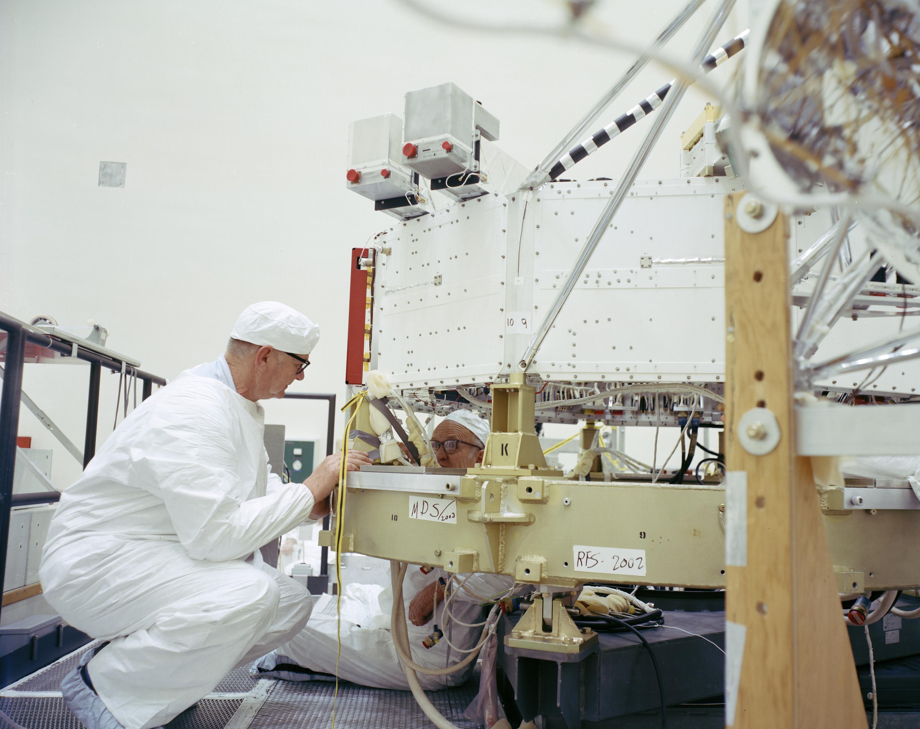 This archival photo shows engineers at NASA's Jet Propulsion Laboratory working on the 10-sided central structure, or "bus," of the Voyager 2 spacecraft on February 24,1977. https://photojournal.jpl.nasa.gov/catalog/PIA21478