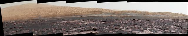 This look ahead from NASA's Curiosity Mars rover includes four geological layers to be examined by the mission, and higher reaches of Mount Sharp beyond the planned study area. The redder rocks of the foreground are part of the Murray formation. Pale gray rocks in the middle distance of the right half of the image are in the Clay Unit. A band between those terrains is "Vera Rubin Ridge." Rounded brown knobs beyond the Clay Unit are in the Sulfate Unit, beyond which lie higher portions of the mountain. The view combines six images taken with the rover's Mast Camera (Mastcam) on Jan. 24, 2017, during the 1,589th Martian day, or sol, of Curiosity's work on Mars, when the rover was still more than half a mile (about a kilometer) north of Vera Rubin Ridge. The panorama has been white-balanced so that the colors of the rock and sand materials resemble how they would appear under daytime lighting conditions on Earth. It spans from east-southeast on the left to south on the right. The Sol 1589 location was just north of the waypoint labeled "Ogunquit Beach" on a map of the area that also shows locations of the Murray formation, Vera Rubin Ridge, Clay Unit and Sulfate Unit. The ridge was informally named in early 2017 in memory of Vera Cooper Rubin (1928-2016), whose astronomical observations provided evidence for the existence of the universe's dark matter. Annotated and full resolution TIFF files are available at https://photojournal.jpl.nasa.gov/catalog/PIA21716