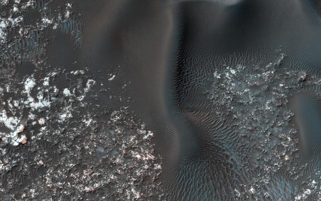 On the west (left) side of this image from NASA's Mars Reconnaissance Orbiter, fairly textbook-looking barchan sand dunes sit atop the bedrock. Barchan dunes pointing in the opposite direction are just a few kilometers away to the east. In between these opposing barchan dunes are star dunes. Barchan dunes form when the sand-moving wind is fairly unidirectional. Star dunes, in contrast, form when the sand-moving wind comes from multiple directions -- not all at once, but from varying directions at different times of day or year. Where is the sand coming from? As with most places on Mars...well, that's an area of on-going research. But the star dunes are telling us that this area seems to be accumulating sand. https://photojournal.jpl.nasa.gov/catalog/PIA21934