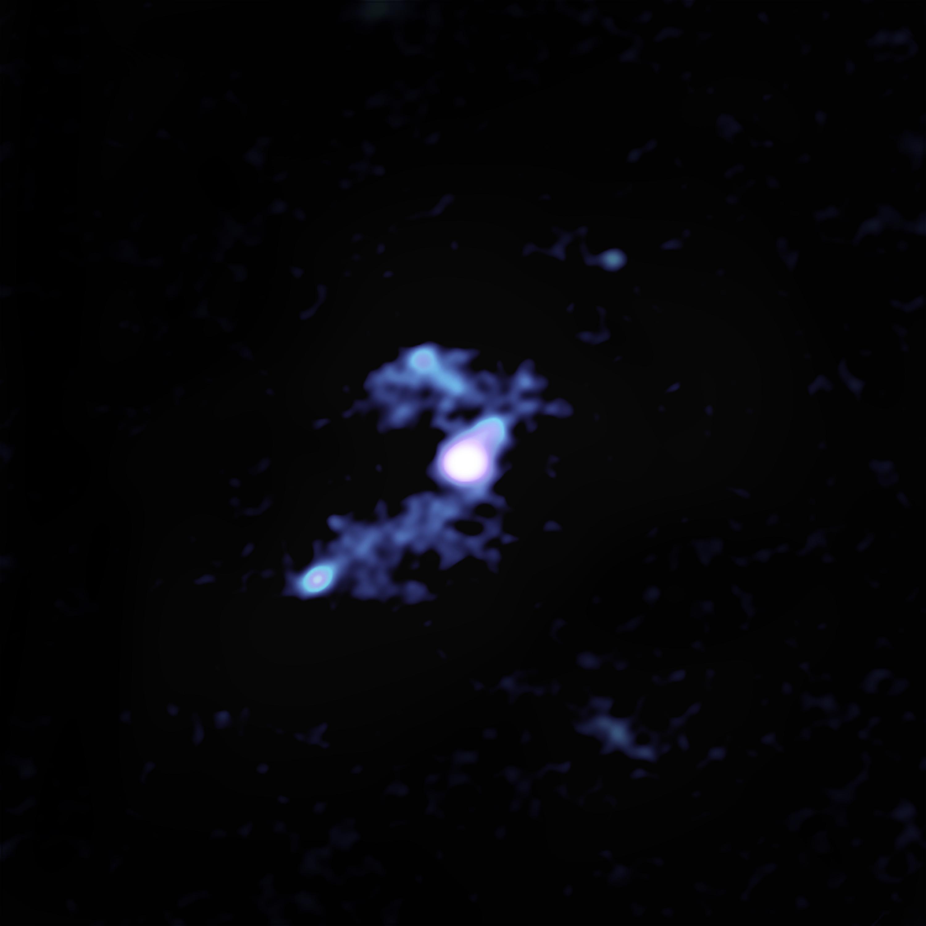 This image of galaxy W2246-0526 was created using data from the Atacama Large Millimeter/submillimeter Array (ALMA) - a collection of individual radio antennas that work together as a single telescope. The galaxy is syphoning material away from three companion galaxies through trans-galactic streamers. The main galaxy and one of its companions are in the center. To the lower left is another companion and its large tidal tail that connects it to the main galaxy. The upper left concentration is the third companion galaxy. https://photojournal.jpl.nasa.gov/catalog/PIA22359