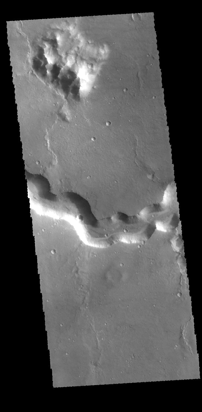 This VIS image shows a section of Bahram Vallis. Bahram Vallis is located on the northeastern margin of Lunae Planum. Orbit Number: 70146 Latitude: 20.6144 Longitude: 302.265 Instrument: VIS Captured: 2017-10-06 22:04 https://photojournal.jpl.nasa.gov/catalog/PIA22363