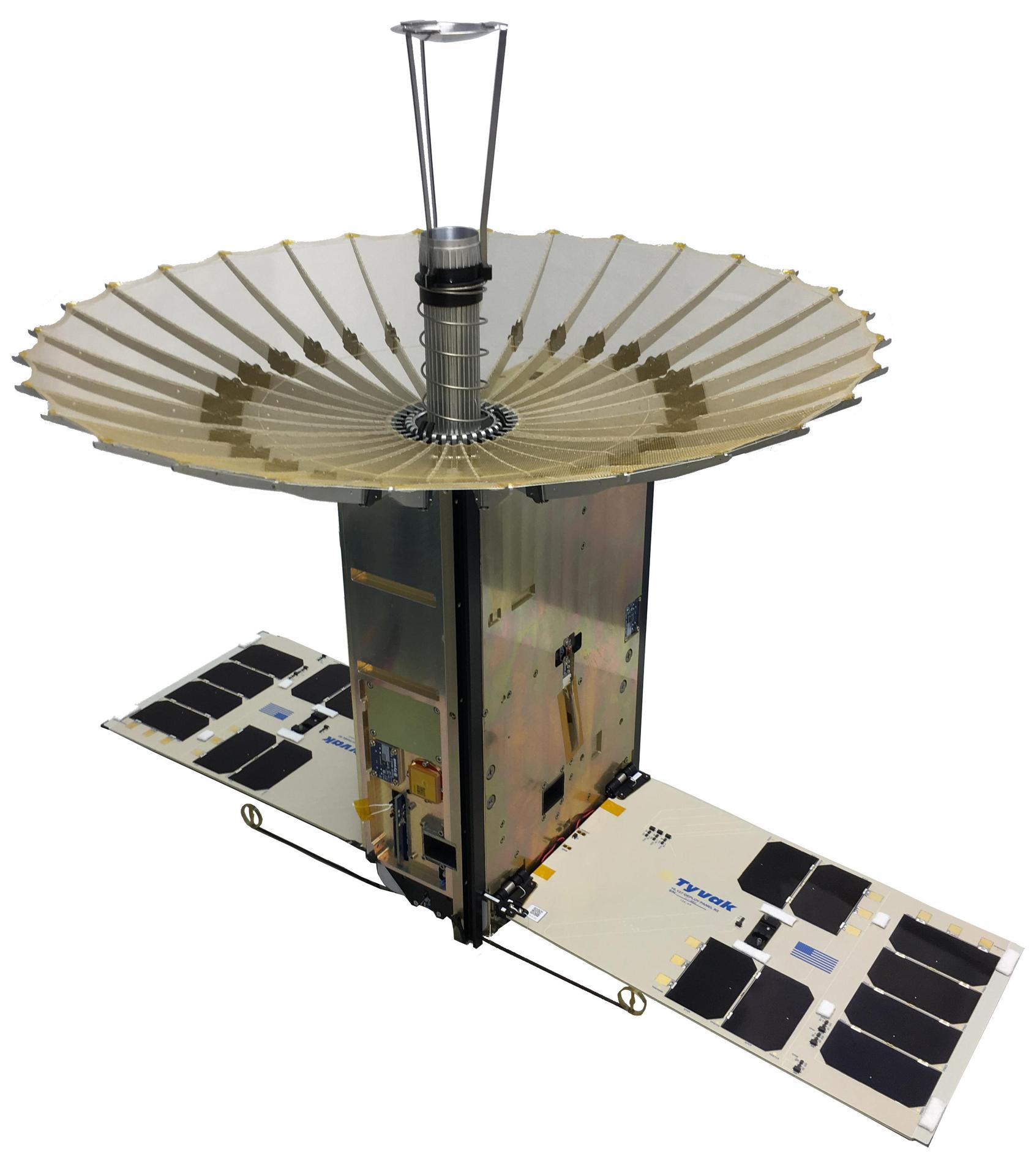 The RainCube 6U CubeSat with fully-deployed antenna. RainCube, CubeRRT and TEMPEST-D are currently integrated aboard Orbital ATKs Cygnus spacecraft and are awaiting launch on an Antares rocket. After the CubeSats have arrived at the station, they will be deployed into low-Earth orbit and will begin their missions to test these new technologies useful for predicting weather, ensuring data quality, and helping researchers better understand storms. https://photojournal.jpl.nasa.gov/catalog/PIA22457