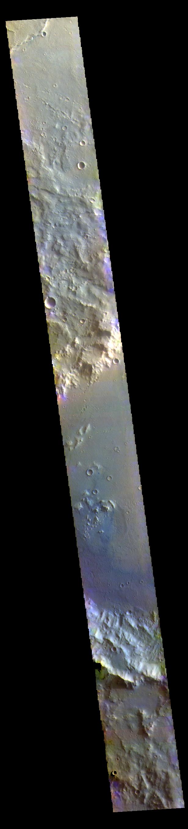 This VIS image shows part of a large unnamed crater in Terra Cimmeria. The THEMIS VIS camera contains 5 filters. The data from different filters can be combined in multiple ways to create a false color image. These false color images may reveal subtle variations of the surface not easily identified in a single band image. Orbit Number: 61409 Latitude: -6.93691 Longitude: 118.806 Instrument: VIS Captured: 2015-10-18 04:10 https://photojournal.jpl.nasa.gov/catalog/PIA22792