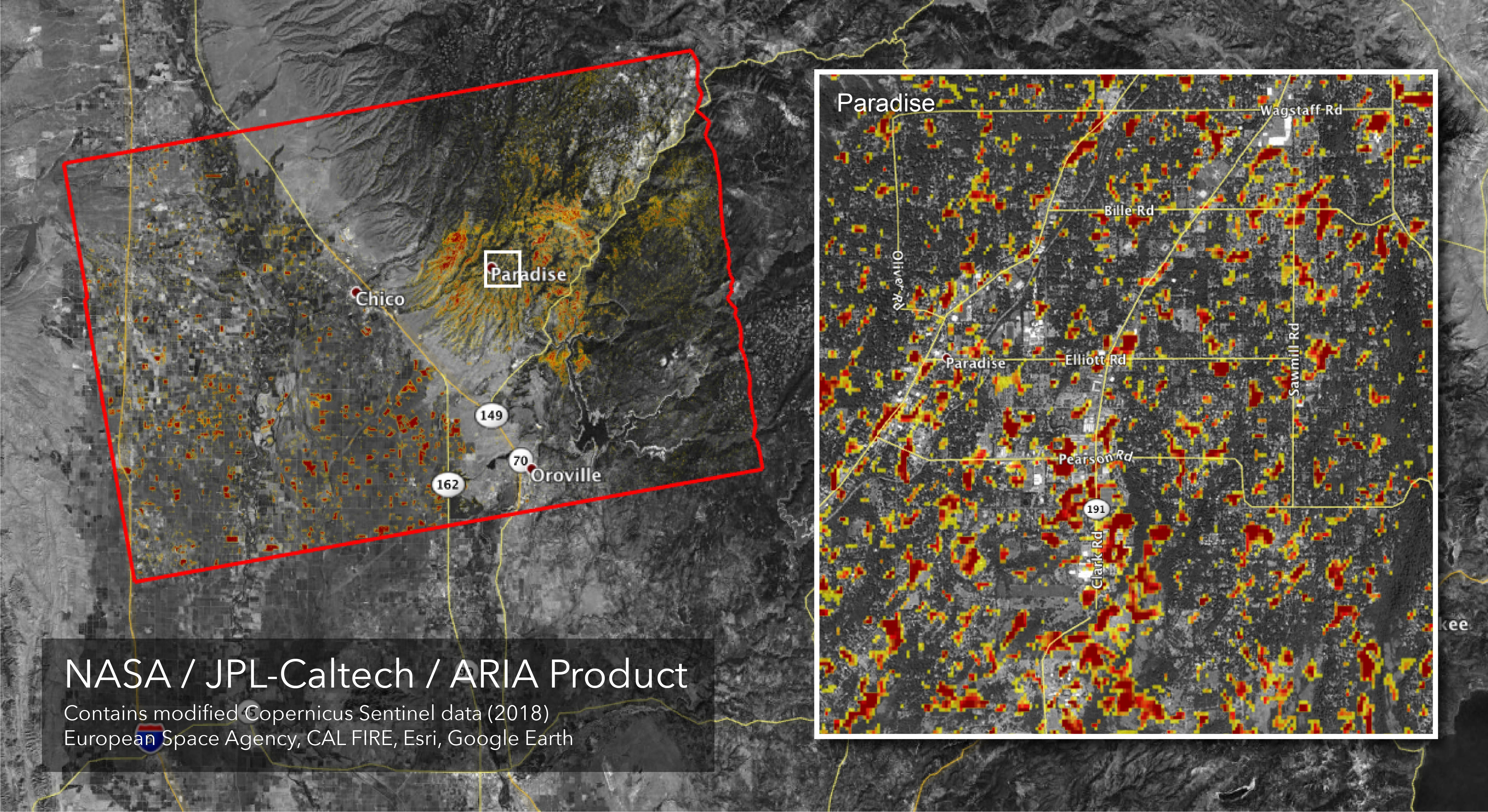The Advanced Rapid Imaging and Analysis (ARIA) team at NASA's Jet Propulsion Laboratory in Pasadena, California, created this Damage Proxy Map (DPM) depicting areas of Northern California that are likely damaged (shown by red and yellow pixels) as a result of the Camp Fire. The map is derived from synthetic aperture radar (SAR) images from the Copernicus Sentinel-1 satellites, operated by the European Space Agency (ESA). The pre-event images were taken before (November 4, 2018) and the post-event image was acquired during the fire (6pm November 16, 2018, both local time). https://photojournal.jpl.nasa.gov/catalog/PIA22819