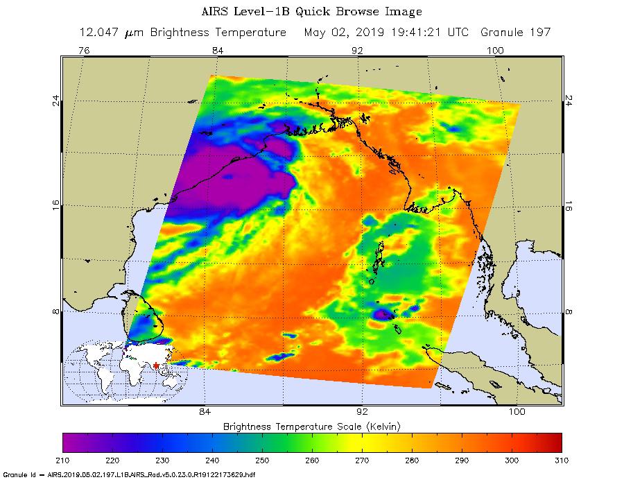 This image shows Tropical Cyclone Fani just off the east coast of India in the Bay of Bengal. NASA's Atmospheric Infrared Sounder (AIRS) collected the image at about 1 p.m. PDT (4 p.m. EDT) today, May 2. At the time, the cyclone's wind speeds were equivalent to a Category 4 hurricane, with maximum sustained winds of 155 mph (249 kph) and gusts of up to 190 mph (306 kph), according to the Joint Typhoon Warning Center. The cyclone is expected to make landfall on Friday, May 3. AIRS, in conjunction with the Advanced Microwave Sounding Unit (AMSU), senses emitted infrared and microwave radiation from Earth to provide a 3D look at weather and climate. The infrared image shows temperatures of the clouds or surface. The large purple area indicates very cold clouds carried high into the atmosphere by deep thunderstorms. Warmer areas, including the eye of the cyclone, are shown in blue. Shallower rain clouds appear green, while the orange areas represent mostly cloud-free air moving away from the storm. https://photojournal.jpl.nasa.gov/catalog/PIA22838