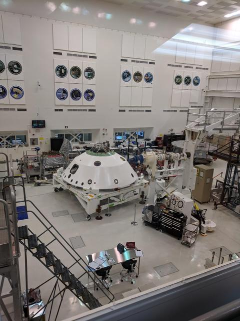 With the backshell that will help protect the Mars 2020 rover during its descent into the Martian atmosphere visible in the foreground, a technician on the project monitors the progress of Systems Test 1. Over two weeks in January 2019, 72 engineers and technicians assigned to the 2020 mission took over the High Bay 1 cleanroom in JPL's Spacecraft Assembly Facility to put the software and electrical systems aboard the mission's cruise, entry capsule, descent stage and rover through their paces. https://photojournal.jpl.nasa.gov/catalog/PIA22966