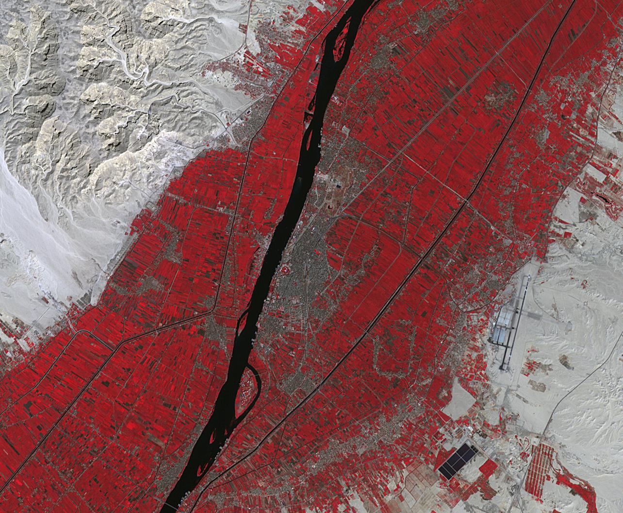 Luxor is a city in Upper Egypt, along the Nile. It is the site of the ancient Egyptian city of Waset, known to the Greeks as Thebes. Luxor is one of the world's greatest open-air museums, with the ruins of the temple complexes of Karnak and Luxor. Immediately across the Nile is the Valley of the Kings, burial place of dozens of Egypt's pharaohs, including King Tutankhamun. The image was acquired October 18, 2017, covers an area of 15.9 by 19.3 kilometers, and is located at 25.7 degrees north, 32.6 degrees east. https://photojournal.jpl.nasa.gov/catalog/PIA23060