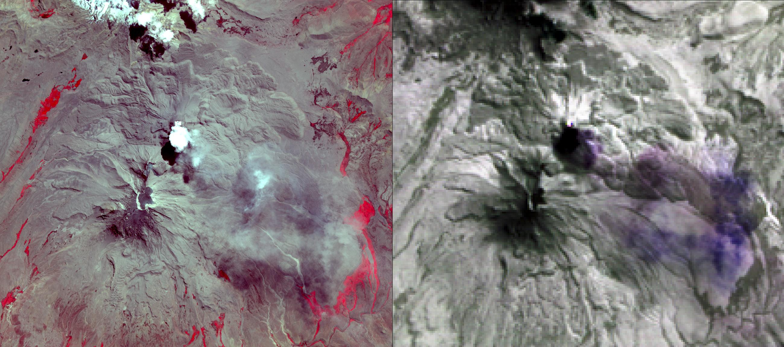 NASA's Advanced Spaceborne Thermal Emission and Reflection Radiometer (ASTER) acquired this image of Peru's Sabancaya stratovolcano on April 10, 2019. Sabancaya has been erupting regularly for several months, sending ash plumes high into the air. At the time this image was taken, the plume reached an altitude of 9100 meters (9950 yards) and was moving southeastward. In the left image, Sabancaya is under the bright round white cloud. The greyish clouds to the southeast are ash plumes. The Ampato volcano, with its prominent summit caldera, is to the south. The red areas are vegetation. The right thermal image shows the plume in purple, indicating that it is dominantly composed of sulfur dioxide gas. A bright hotspot can be seen directly north of the black (cold) cloud over Sabancaya. The image covers an area of 19.5 by 17.2 kilometers (12 miles by 11 miles), and is located at 15.8 degrees south, 71.9 degrees west. https://photojournal.jpl.nasa.gov/catalog/PIA23143