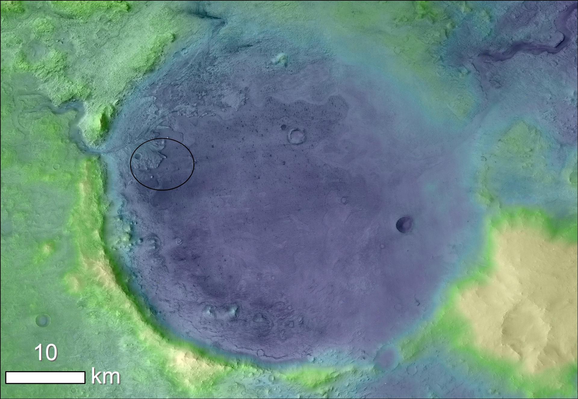 Lighter colors represent higher elevation in this image of Jezero Crater on Mars, the landing site for NASA's Mars 2020 mission. The oval indicates the landing ellipse, where the rover will be touching down on Mars. The color added to this image helps the crater rim stand out clearly, and makes it easier to spot the shoreline of a lake that dried up billions of years ago. Scientists want to visit this shoreline because it may have preserved fossilized microbial life, if any ever formed on Mars. The image was created using data from a combination of instruments and spacecraft: NASA's Mars Global Surveyor and its Mars Orbiter Laser Altimeter (MOLA); NASA's Mars Reconnaissance Orbiter and its Compact Reconnaissance Imaging Spectrometer for Mars (CRISM) and Context Camera (CTX); and the European Space Agency's Mars Express and its High Resolution Stereo Camera (HRSC). https://photojournal.jpl.nasa.gov/catalog/PIA23511