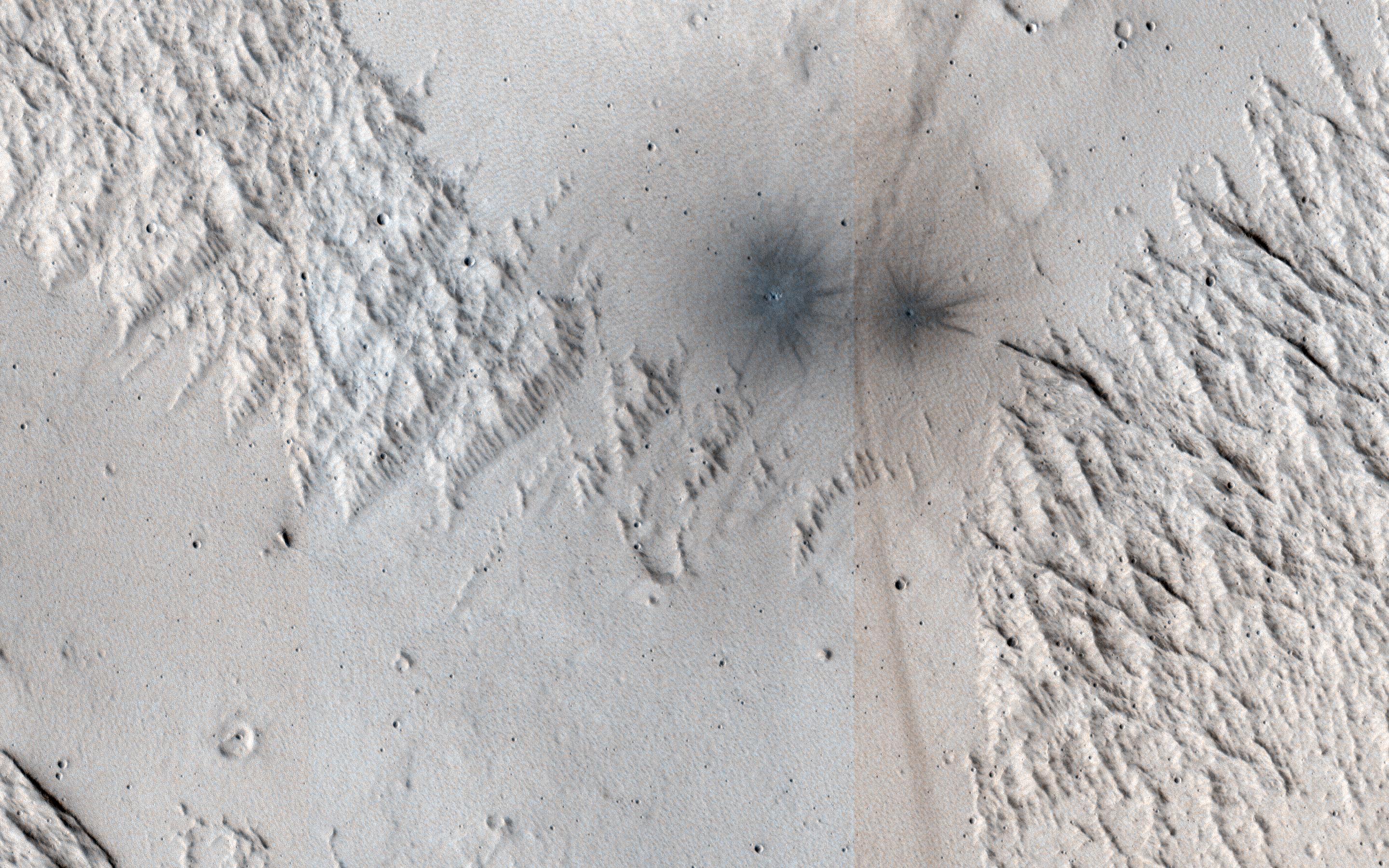 This image shows terrain near Mangala Valles. At the bottom of the image are two black spots that are recent impact craters. The black spots form because the craters exposed cleaner materials in the subsurface beneath the bright, dusty surface. Our image is also interesting because the surface has a criss-cross pattern formed by wind activity. Bright ripples that are oriented from the upper right to the lower left are perpendicular to the wind flow. In contrast, outcrops that have been eroded by the wind are oriented perpendicular to the ripples to produce the criss-cross pattern we now observe. https://photojournal.jpl.nasa.gov/catalog/PIA24146