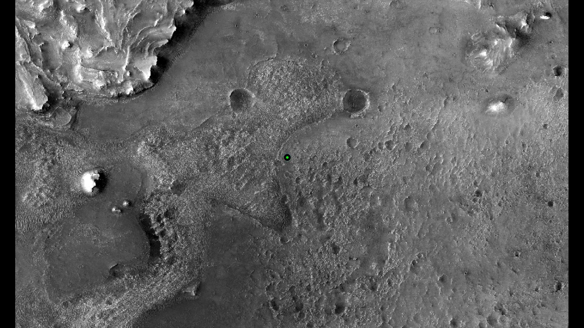 This image shows with a green dot where NASA's Perseverance rover landed in Jezero Crater on Mars on Feb. 18, 2021. The base image was taken by the HiRISE camera aboard NASA's Mars Reconnaissance Orbiter. A key objective for Perseverance's mission on Mars is astrobiology, including the search for signs of ancient microbial life. The rover will characterize the planet's geology and past climate, pave the way for human exploration of the Red Planet, and be the first mission to collect and cache Martian rock and regolith (broken rock and dust). Subsequent NASA missions, in cooperation with ESA (European Space Agency), would send spacecraft to Mars to collect these sealed samples from the surface and return them to Earth for in-depth analysis. The Mars 2020 Perseverance mission is part of NASA's Moon to Mars exploration approach, which includes Artemis missions to the Moon that will help prepare for human exploration of the Red Planet. https://photojournal.jpl.nasa.gov/catalog/PIA24331