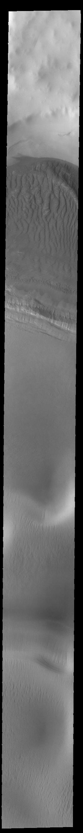 Today's VIS image shows an unnamed crater located on the margin of the south polar cap. A very large mound of sand on the crater floor merges with the edge of the polar ice. The dunes in the crater appear different from other crater dunes on Mars due to the influence of ice within the sand. Orbit Number: 84231 Latitude: -72.3612 Longitude: 143.513 Instrument: VIS Captured: 2020-12-09 20:51 https://photojournal.jpl.nasa.gov/catalog/PIA24410