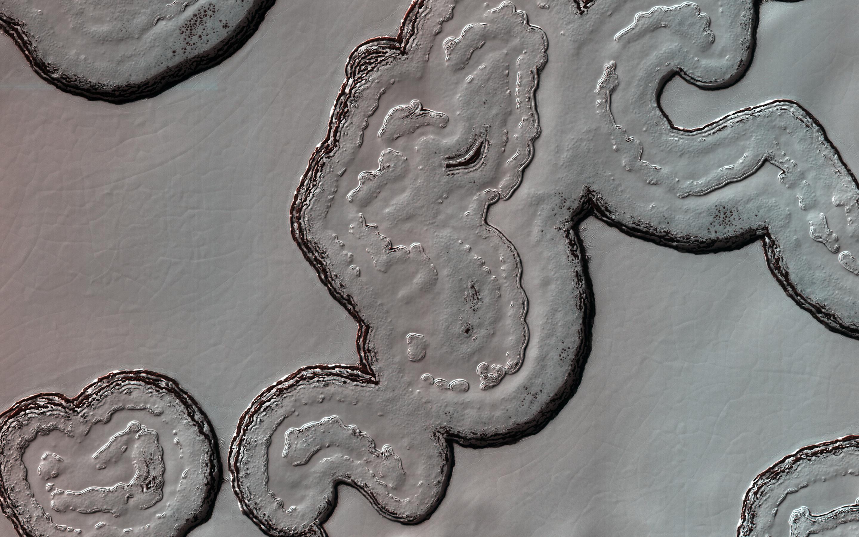 This intriguing, almost cartoon-like terrain is composed of coalescing pits and smooth-topped mesas, forming part of what is known as the Residual South Polar Cap (RSPC) of Mars. The RSPC is a permanent deposit of carbon dioxide (dry) ice that is several kilometers thick and overlies a much larger water ice cap. This part of the RSPC lies at an elevation of about 6.5 kilometers. The mesas are several kilometers long while the pits range in diameter up to several hundred meters. The dark regions surrounding the mesas are thought to be exposed water ice. This image was taken during southern summer when the brighter-appearing dry ice cap sublimates (evaporates directly from ice to vapor) exposing the darker, underlying water ice cap. Understanding the seasonal and yearly volumes of carbon dioxide exchange between the surface and the atmosphere provides important insights into Mars' climate. https://photojournal.jpl.nasa.gov/catalog/PIA24463