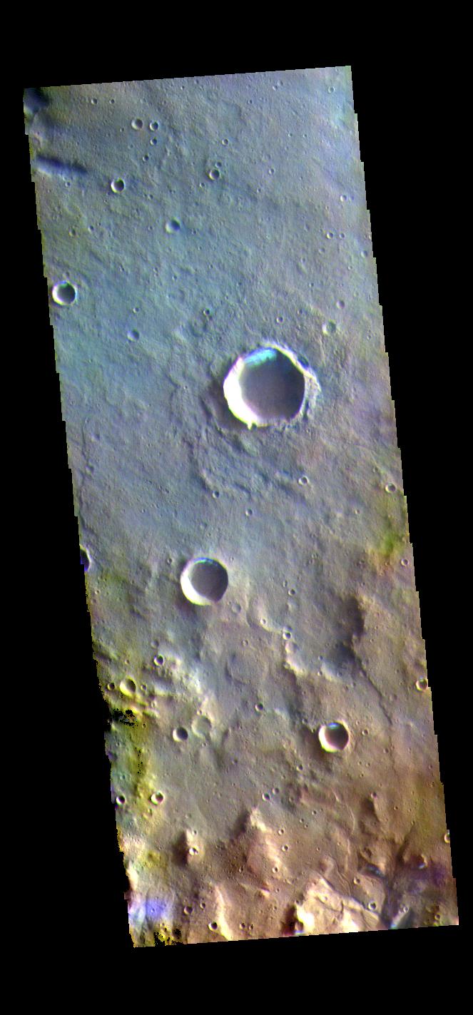 The THEMIS VIS camera contains 5 filters. The data from different filters can be combined in multiple ways to create a false color image. These false color images may reveal subtle variations of the surface not easily identified in a single band image. Today's false color image shows several small, unnamed craters in Terra Sirenum. The bright blue region on the inner crater rim is morning frost. Collected during the winter, south facing slopes stay in shadow and retain frost longer than the rest of the rim already in sunlight. Frosts are only identifiable in multi filter images. Orbit Number: 80442 Latitude: -36.3327 Longitude: 198.274 Instrument: VIS Captured: 2020-02-01 21:41 https://photojournal.jpl.nasa.gov/catalog/PIA24676