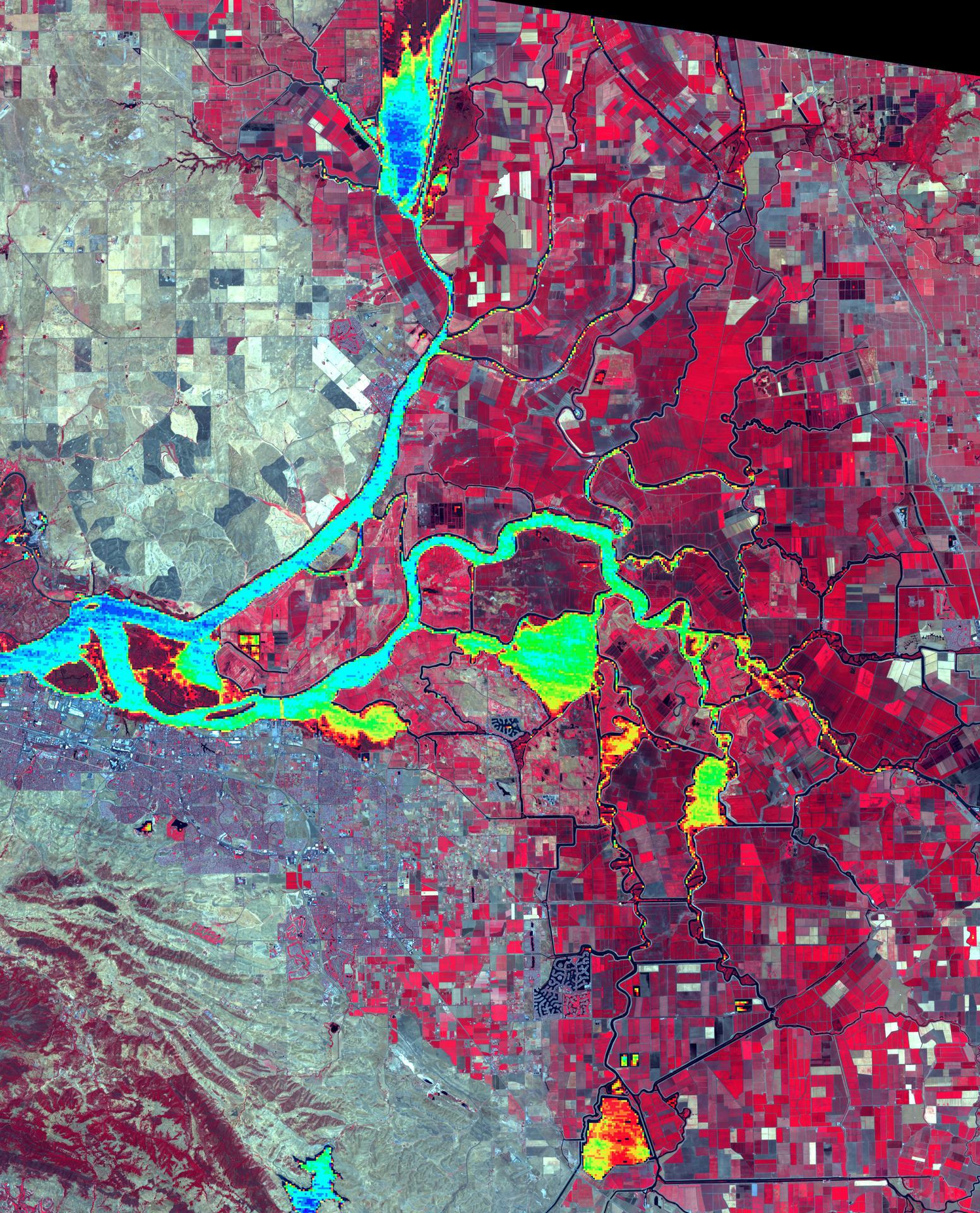 The Sacramento-San Joaquin River Delta, CA (or California Delta) has an area of about 3000 km2, and provides a large fraction of all the water used in California. The Delta drains about 50% of the water coming from the Sierra Nevada Mountains, and channels it through San Francisco's Golden Gate to the Pacific Ocean. Thousands of miles of levees now carefully control the Delta's flow, to maximize water use. The image combines a false color infrared composite (with vegetation depicted in red) with a colorized thermal infrared band to show the water temperature for the larger water bodies. Warmer temperatures are red and yellow, cooler water temperatures are blue and green. The image was acquired July 3, 2012, covers an area of 46.5 by 57.5 km, and is located at 38.1 degrees north, 121.3 degrees west. https://photojournal.jpl.nasa.gov/catalog/PIA24691