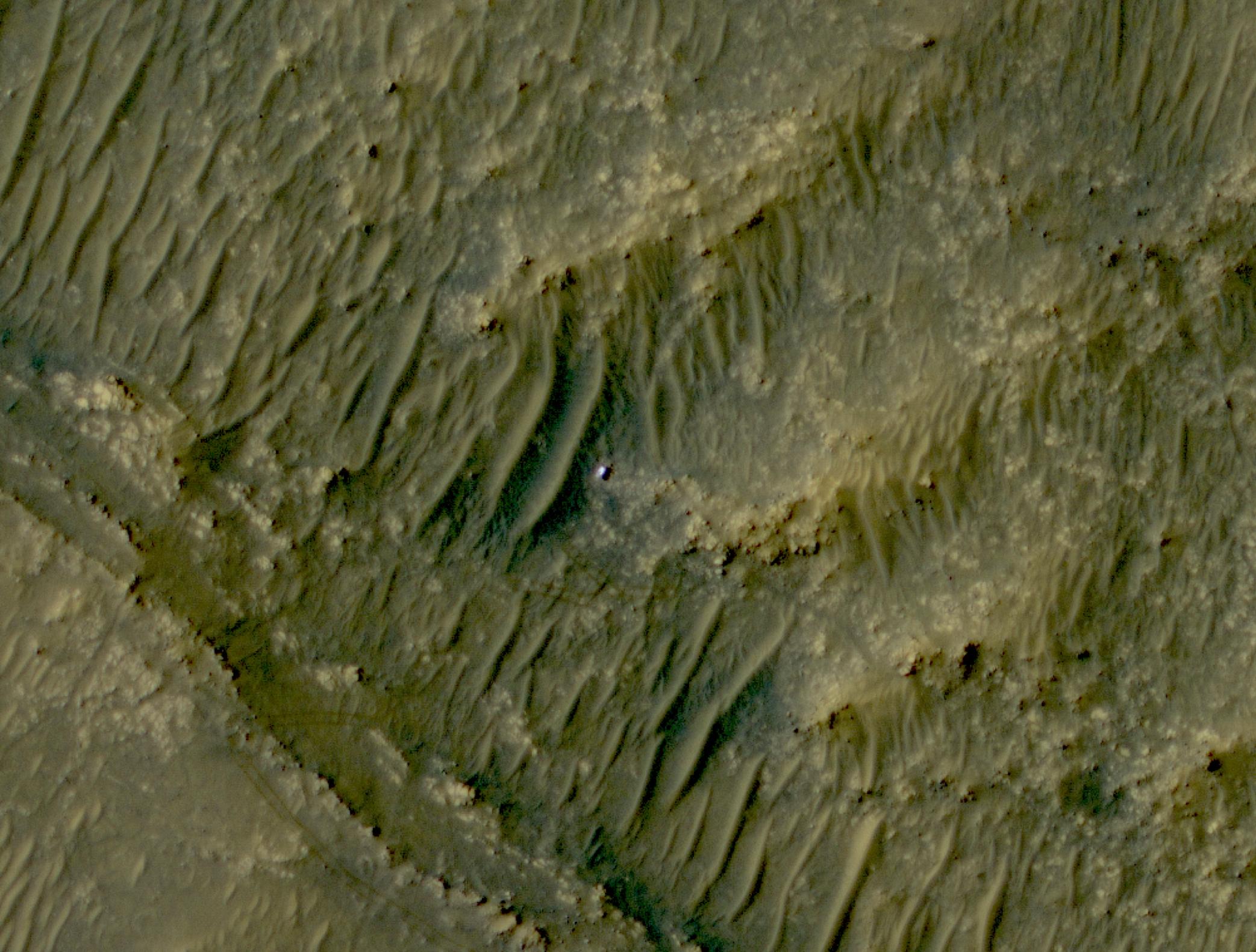 The white speck is NASA's Perseverance rover in the "South Séítah" area of Mars' Jezero Crater. The image was taken by the agency's Mars Reconnaissance Orbiter using its High-Resolution Imaging Science Experiment, or HiRISE, camera. The University of Arizona, in Tucson, operates HiRISE, which was built by Ball Aerospace & Technologies Corp., in Boulder, Colorado. NASA's Jet Propulsion Laboratory, a division of Caltech in Pasadena, California, manages the Mars Reconnaissance Orbiter Project for NASA's Science Mission Directorate in Washington. A key objective for Perseverance's mission on Mars is astrobiology, including the search for signs of ancient microbial life. The rover will characterize the planet's geology and past climate, pave the way for human exploration of the Red Planet, and be the first mission to collect and cache Martian rock and regolith (broken rock and dust). Subsequent NASA missions, in cooperation with ESA (European Space Agency), would send spacecraft to Mars to collect these sealed samples from the surface and return them to Earth for in-depth analysis. The Mars 2020 Perseverance mission is part of NASA's Moon to Mars exploration approach, which includes Artemis missions to the Moon that will help prepare for human exploration of the Red Planet. https://photojournal.jpl.nasa.gov/catalog/PIA24837