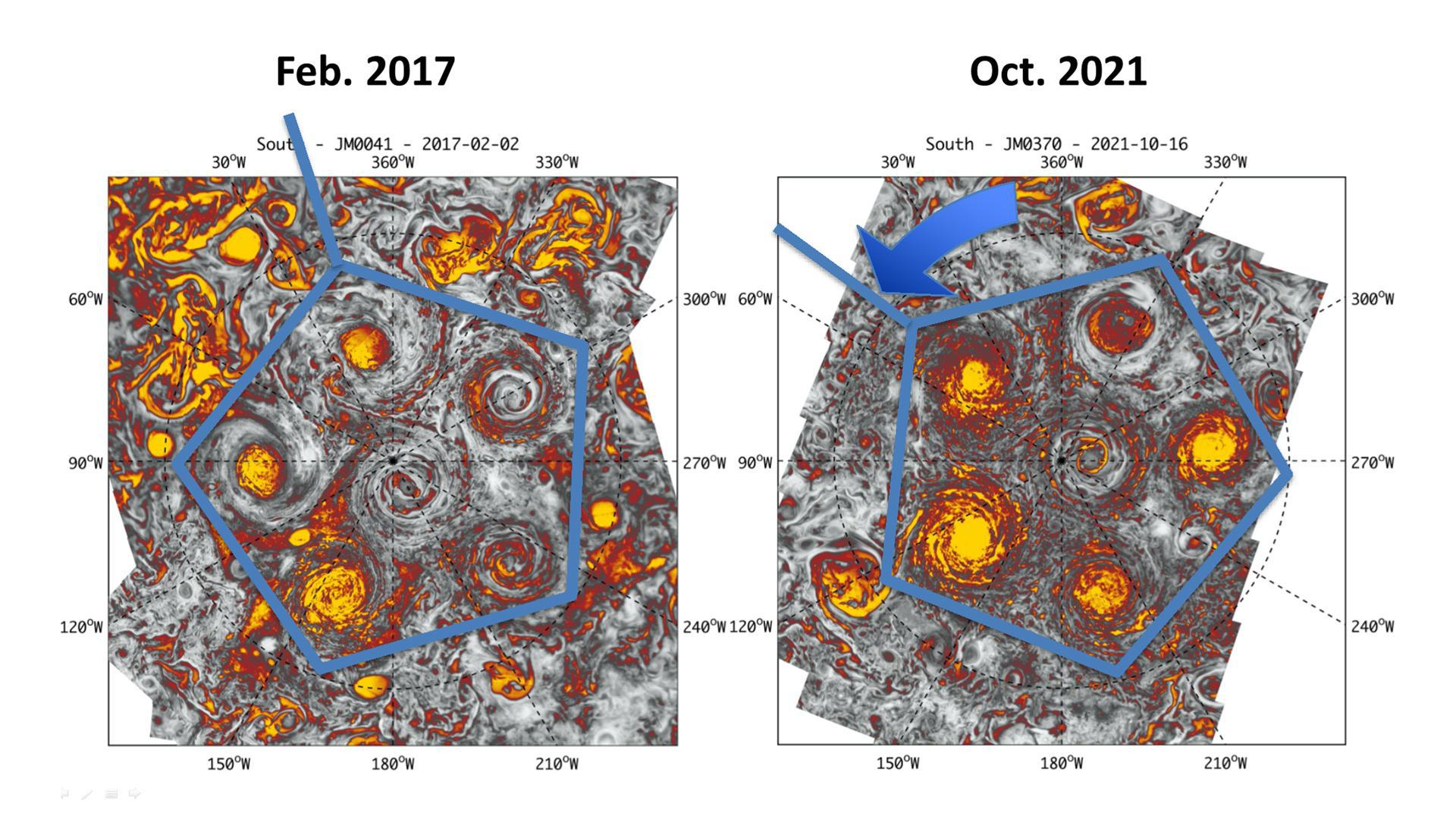 This annotated composite image depicts the movement of the polar and circumpolar cyclones of Jupiter's south pole between 2016 (left) and 2021 (right) as seen by the Jovian Infrared Auroral Mapper (JIRAM) instrument aboard NASA's Juno spacecraft. In both images, five cyclones are arranged as a pentagon, with a sixth cyclone in the center (south pole). JIRAM "sees" in infrared light not visible to the human eye. It was designed to capture the infrared light emerging from deep inside Jupiter, probing the weather layer down to 30 to 45 miles (50 to 70 kilometers) below Jupiter's cloud tops. https://photojournal.jpl.nasa.gov/catalog/PIA24967