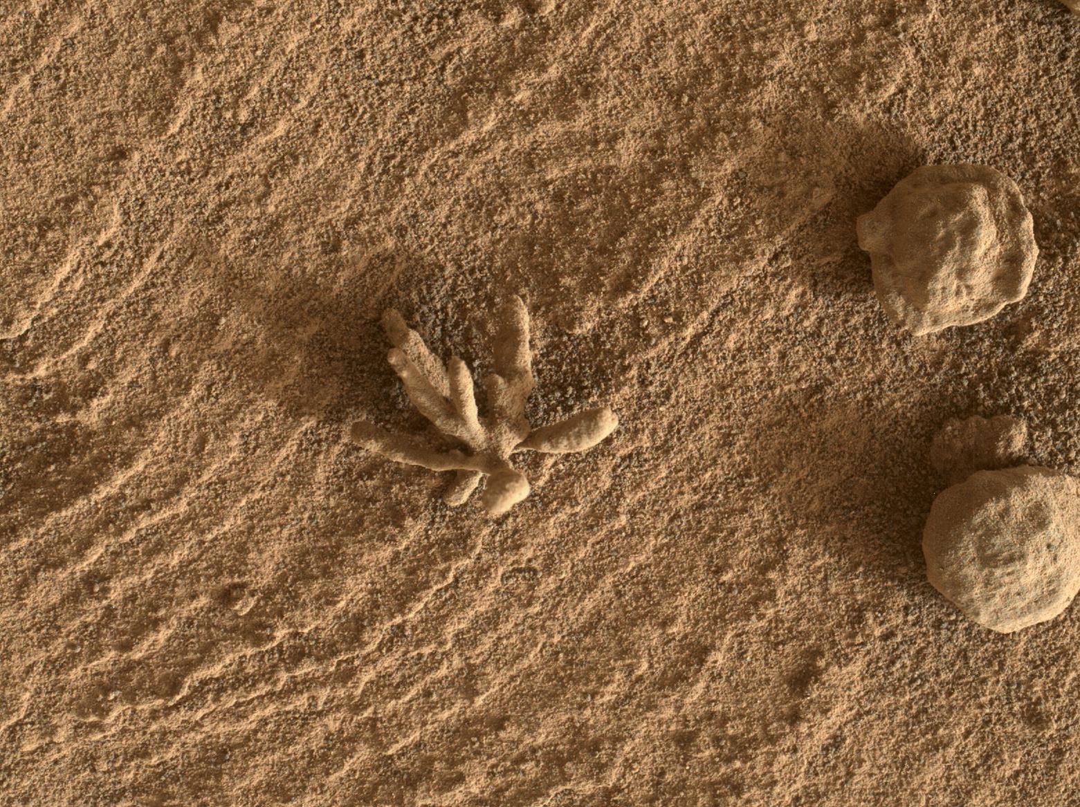 Smaller than a penny, the flower-like rock artifact on the left was imaged by NASA's Curiosity Mars rover using its Mars Hand Lens Imager (MAHLI) camera on the end of its robotic arm. The image was taken on Feb. 24, 2022, the 3,396th Martian day, or sol, of the mission. The "flower," along with the spherical rock artifacts seen to the right, were made in the ancient past when minerals carried by water cemented the rock. Figure 1 shows a tighter view of the flower-like feature. Curiosity has in the past discovered a diverse assortment of similar small features that formed when mineralizing fluids traveled through conduits in the rock. Images of such features are helping scientists understand more about the prolonged history of liquid water in Gale Crater. https://photojournal.jpl.nasa.gov/catalog/PIA25077