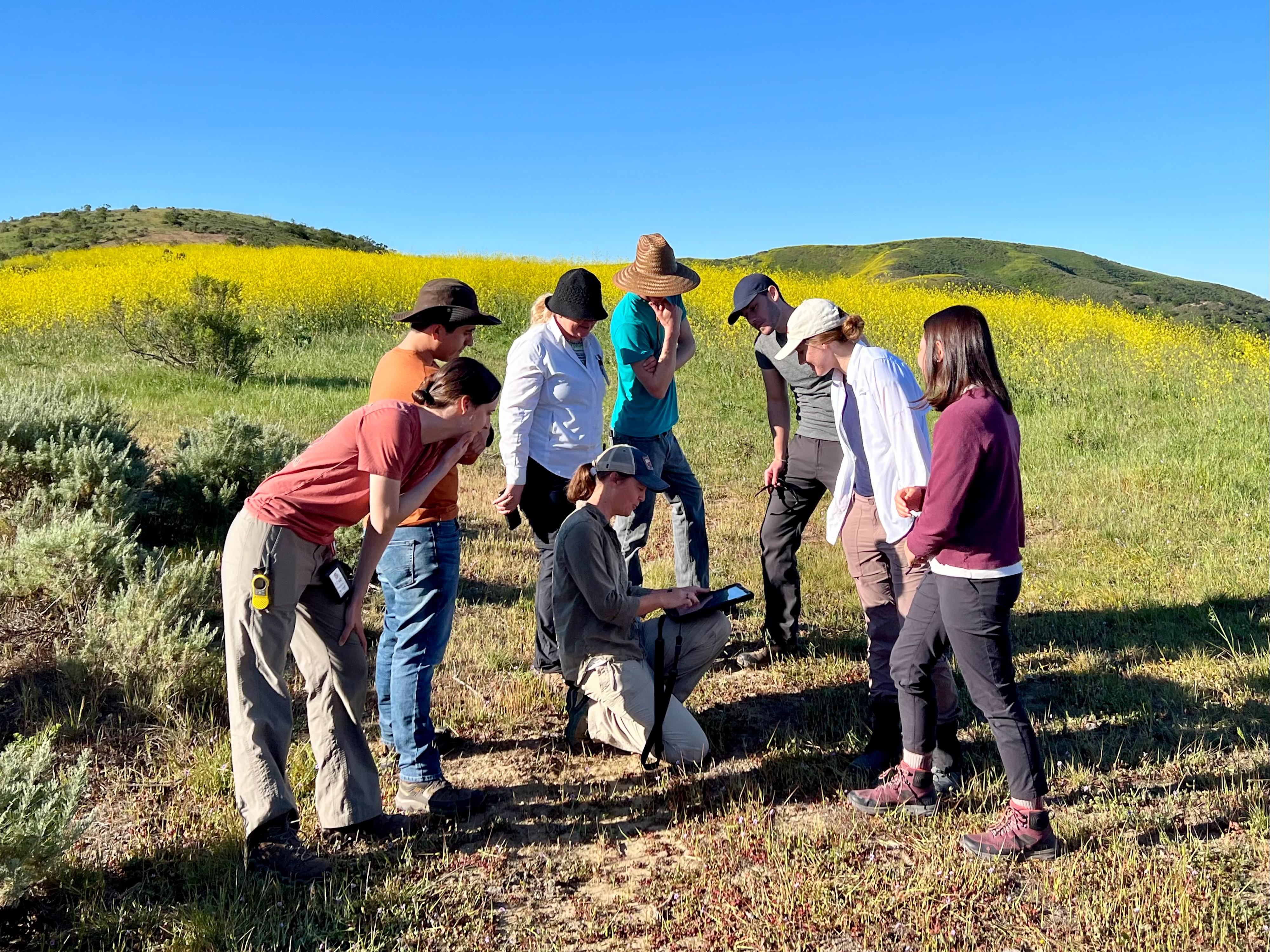 Dana Chadwick, a scientist in the water and ecosystems group at NASA's Jet Propulsion Laboratory, center, advises a field team of researchers from JPL; University of Wisconsin, Madison (UWM); University of California, Los Angeles (UCLA); University of Maryland, Baltimore County (UMBC); and University of California, Santa Barbara (UCSB) on vegetation-sampling locations at the Jack and Laura Dangermond Preserve in Santa Barbara County, California, on March 24, 2022. Chadwick and the team are working on the Surface Biology and Geology High-Frequency Time Series (SHIFT) campaign, which is jointly led by JPL, UCSB, and The Nature Conservancy. Chadwick is surrounded by, from left: Natalie Queally, a forest and wildlife ecology graduate student at UWM; Francisco Ochoa, a geography graduate student at UCLA; Petya Campbell, a research associate professor at UMBC and a research associate at NASA's Goddard Space Flight Center; Brendan Heberlein, a research intern at UWM; Renato Braghiere, a postdoctoral research scientist at JPL; Cassandra Nickles, a postdoctoral fellow at JPL; and Clare Saiki, a doctoral student at UCSB. Operating between late February and late May 2022, SHIFT combines the ability of airborne science instruments to gather data over widespread areas with the more concentrated observations scientists conduct in the field to study the functional characteristics, health, and resilience of plant communities. The sampling and analysis done by researchers on the ground and in the ocean is intended to validate data taken by AVIRIS-NG (Airborne Visible/Infrared Imaging Spectrometer-Next Generation). The instrument, designed at JPL, is collecting spectral data of vegetation it observes during weekly flights in an aircraft over a 640-square-mile (1,656-square-kilometer) study area in Santa Barbara County and coastal Pacific waters. The campaign is a pathfinder for NASA's proposed Surface Biology and Geology (SBG) mission. SHIFT will help scientists design data collection and processing algorithms for that mission, which would launch no earlier than 2028. The SHIFT data is also intended to support the research and conservation objectives of The Nature Conservancy, which owns the Dangermond Preserve, and UCSB, which operates the Sedgwick Reserve, another nature preserve within the study area. More than 60 scientists from institutions around the U.S. have indicated they intend to use the SHIFT data in their research. https://photojournal.jpl.nasa.gov/catalog/PIA25141