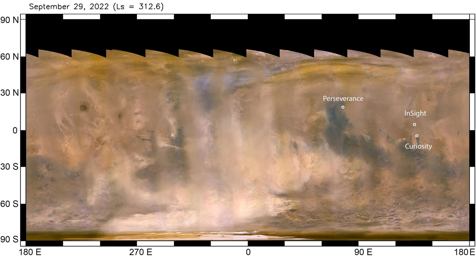 The beige clouds seen in this flat global map of Mars are a continent-size dust storm captured on Sept. 29, 2022 by the Mars Color Imager (MARCI) camera aboard NASA's Mars Reconnaissance Orbiter (MRO). As MRO passes over the planet, MARCI takes linear images – essentially strips – of the planet's circumference each day. The images are then stitched together to create a daily global map of the planet, showing atmospheric features across the planet as seen at the same time of day (mid-afternoon). Comparison of daily maps show atmospheric changes over time. Besides providing unique scientific data, MARCI's global maps are useful for monitoring weather changes that could affect NASA's surface missions. The agency's Perseverance, Curiosity, and InSight missions are also labeled, showing the vast distances between them. NASA's Perseverance rover and Ingenuity helicopter, are located at the white dot farthest north, roughly 2,147 miles (3,455 kilometers) from the agency's InSight lander, just above the equator. The Curiosity rover is just below the equator, about 373 miles (600 kilometers) from InSight. Neither Curiosity nor Perseverance and Ingenuity (the helicopter must remain relatively close to Perseverance, which serves as its base station) can travel the distance to the solar-powered InSight lander. The regional dust storm in this map was first observed Sept. 21. By the time these images were taken (Sept. 29), it had expanded considerably. Within the following week, the storm appeared to have entered its decay phase, when it's no longer lifting dust into the atmosphere. At that point, the dust that has already been lofted into the atmosphere and spread far beyond the dust-raising sector can take weeks to settle back to the surface. While this particular storm was roughly 2,175 miles (3,500 kilometers) from InSight, it lofted enough dust to significantly reduce the energy being produced by the lander's solar arrays, which have become covered by dust since the spacecraft landed in November 2018. The lander has long since surpassed its primary mission. With its power steadily declining, it is now close to the end of its extended mission, conducting "bonus science" by measuring marsquakes, which reveal details about the deep interior of the Red Planet. https://photojournal.jpl.nasa.gov/catalog/PIA25412