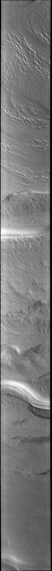 Today's VIS image shows part of the south polar cap. This image was taken at the start of southern summer, and the surface frost has sublimated away. The cap was created over millions of years with deposition of ice and dust during different seasons, creating layers. The ice surface contains several different textures which can be seen in this image. The south polar cap is called Australe Planum. Orbit Number: 89638 Latitude: -86.8307 Longitude: 296.694 Instrument: VIS Captured: 2022-02-28 01:53 https://photojournal.jpl.nasa.gov/catalog/PIA25455