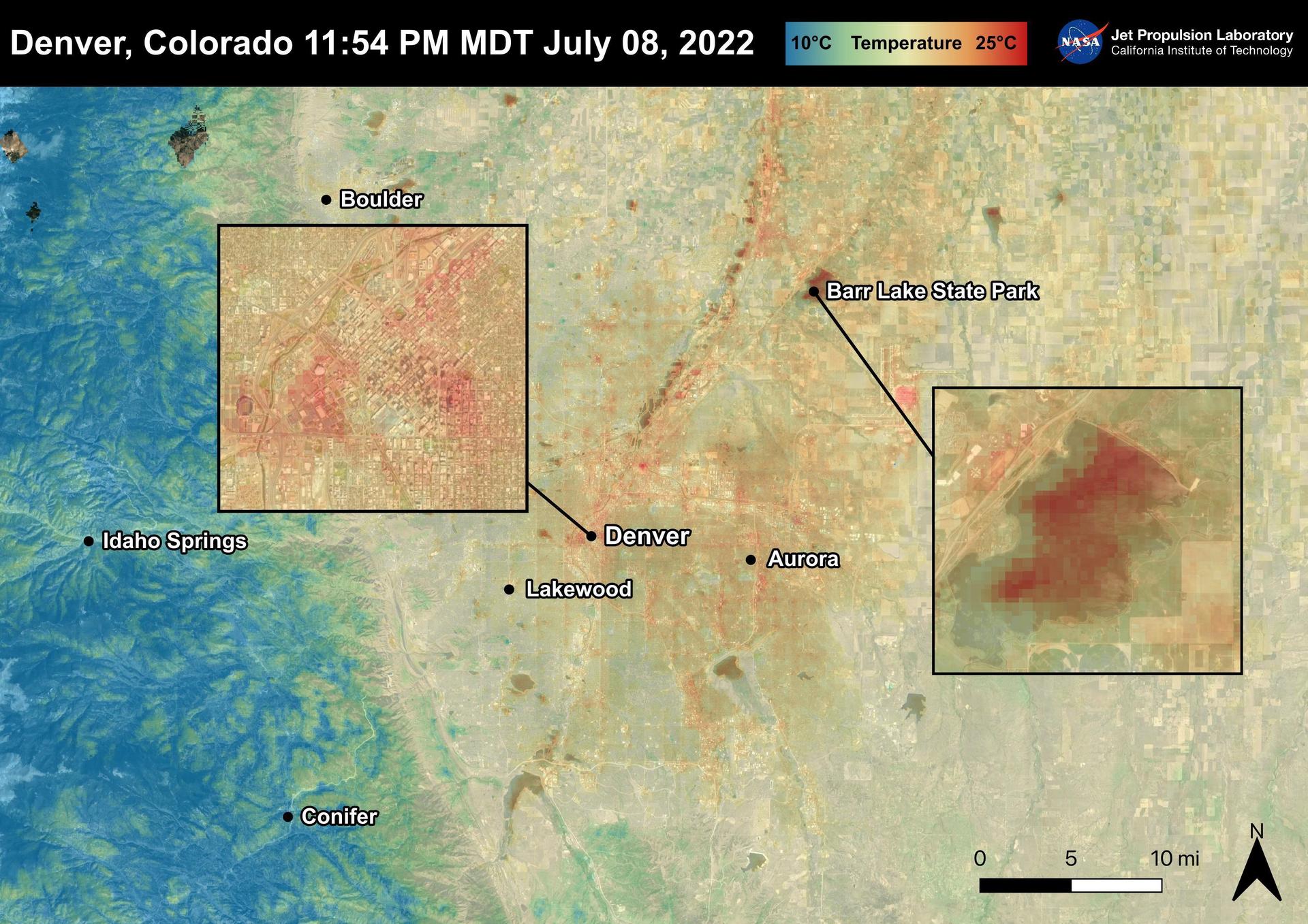 Denver, Colorado reached 96 degrees Fahrenheit on July 8th, 2022. In the two days following, temperatures rose to 101 degrees Fahrenheit. For cities like Denver, heat dissipates more slowly and create urban heat islands. High temperatures due to urban heat, especially at night, can lead to adverse health effects in vulnerable populations like children and the elderly. This image also shows that bodies of water, like Barr Lake, remain warm into the night due to water's high heat capacity. ECOSTRESS captured this Land Surface Temperature image on July 8th, 2022 at 11:54 PM MDT. ECOSTRESS is a thermal instrument on the International Space Station that measures the temperature of the ground, which is hotter than the air temperature during the day. It was launched to the space station in 2018. Its primary mission is to identify critical thresholds of water use and water stress in plants and to detect the timing, location, and predictive factors leading to plant water uptake decline and/or cessation. The nature of the high-resolution data provided by ECOSTRESS allows it to record heat related phenomena such as heat waves and wildfires. https://photojournal.jpl.nasa.gov/catalog/PIA25483