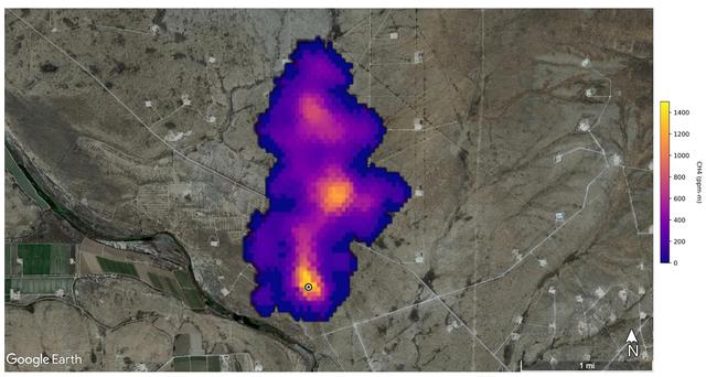 A plume of methane – a potent greenhouse gas about 80 times more effective at trapping heat in the atmosphere than carbon dioxide – is detected flowing from an area southeast of Carlsbad, New Mexico, in an image that uses data from NASA's Earth Surface Mineral Dust Source Investigation (EMIT) mission. The 2-mile (3.3-kilometer) long plume originates in an area known as the Permian Basin, which spans parts of southeastern New Mexico and western Texas and is one of the largest oilfields in the world. EMIT uses an imaging spectrometer to detect the unique pattern of reflected and absorbed light – called a spectral fingerprint – from various materials on Earth's surface and in its atmosphere. Perched on the International Space Station, EMIT was originally intended to map the prevalence of minerals in Earth's arid regions, such as the deserts of Africa and Australia. Scientists verified that EMIT could also detect methane and carbon dioxide when they were checking the accuracy of the image spectrometer's mineral data. The data for these images was collected by EMIT in August 2022. Scientists estimate flow rates of 20.2 tons (18.3 metric tons) per hour at the Permian site, 55.6 tons (50.4 metric tons) per hour in total for the Turkmenistan sources, and 9.4 tons (8.5 metric tons) per hour at the Iran site. While quite large, these emission rates are broadly consistent with previous studies of locations like the Permian Basin, as well as emission source types like landfills. The Turkmenistan example has a similar magnitude to the 2015 Aliso Canyon Blowout. https://photojournal.jpl.nasa.gov/catalog/PIA25592