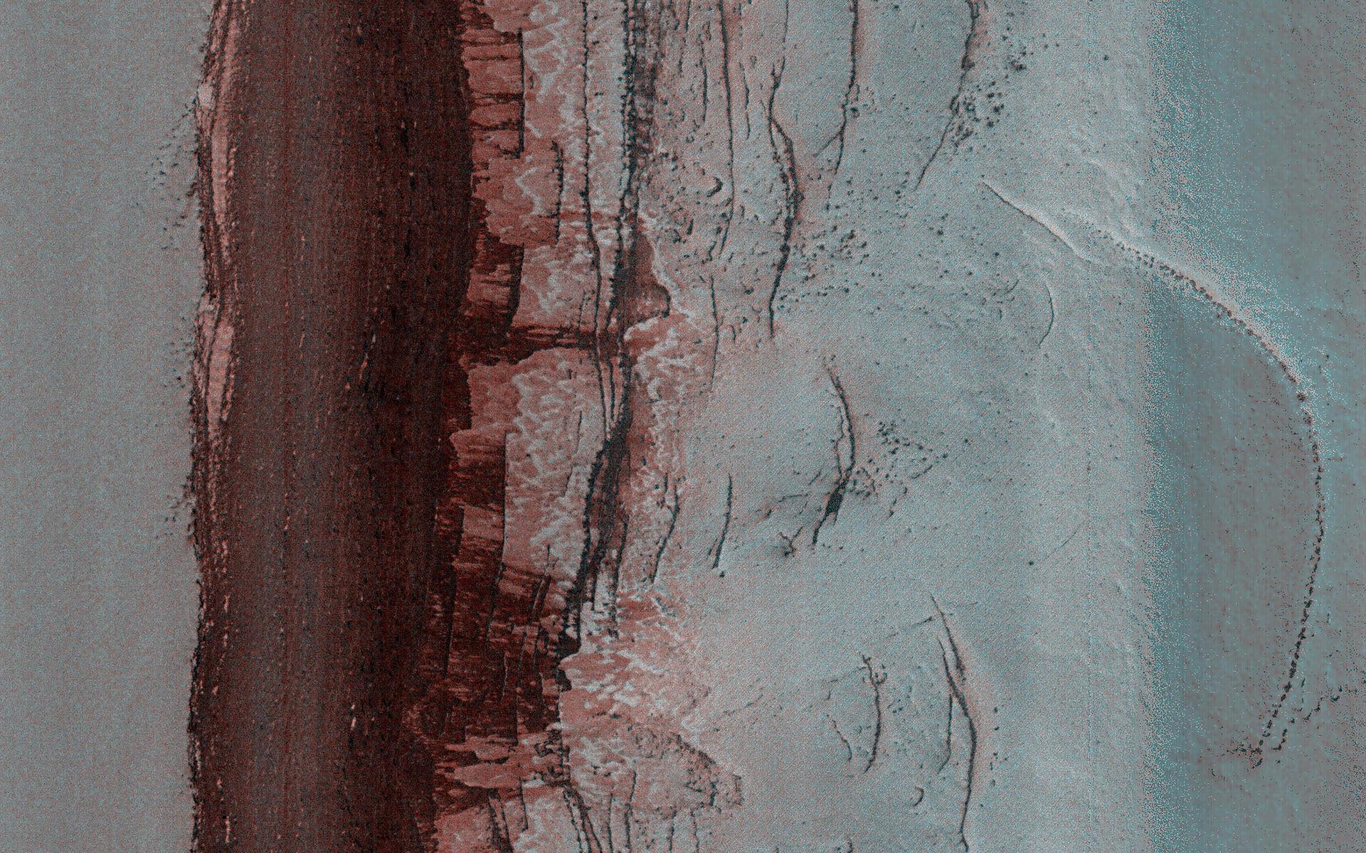 This very steep (more than 60 degrees) scarp shows mass wasting activity every year in the early northern spring, when it is first illuminated after the period of winter darkness. This observation was an attempt to image in late northern winter, in spite of poor illumination. The solar incidence angle is 91.3 degrees, meaning that the Sun is just below the horizon and there was no direct lighting when this image was acquired. However, the atmosphere scatters light to create some diffuse lighting, and the surface is very bright from winter frost deposition, so a useful image of the surface was obtained. The image reveals relatively dark streaks down the steep slope, so mass wasting activity has already started. There is some direct illumination here close to noontime at this time of year, which may be sufficient to initiate some activity. https://photojournal.jpl.nasa.gov/catalog/PIA25792
